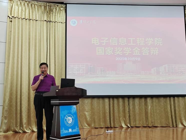 为严格落实国家奖学金评选政策,充分发挥优秀学子的朋辈引领作用,营造“比学赶超、笃行致远”的育人氛围,10月9日晚,电信学院 2025 年度国家奖学金评审大会在图书馆报告厅隆重召开。学院党委副书记王海云、全体辅导员及大一全体学生到场参会,学院关工委副主任张乃钟教授、院长助理王安成、教务代表李爱华、辅导员代表柯永斌、专业教师代表胡晓朋共同组成评审委员会,以专业视角与严谨态度全程参与评审工作。