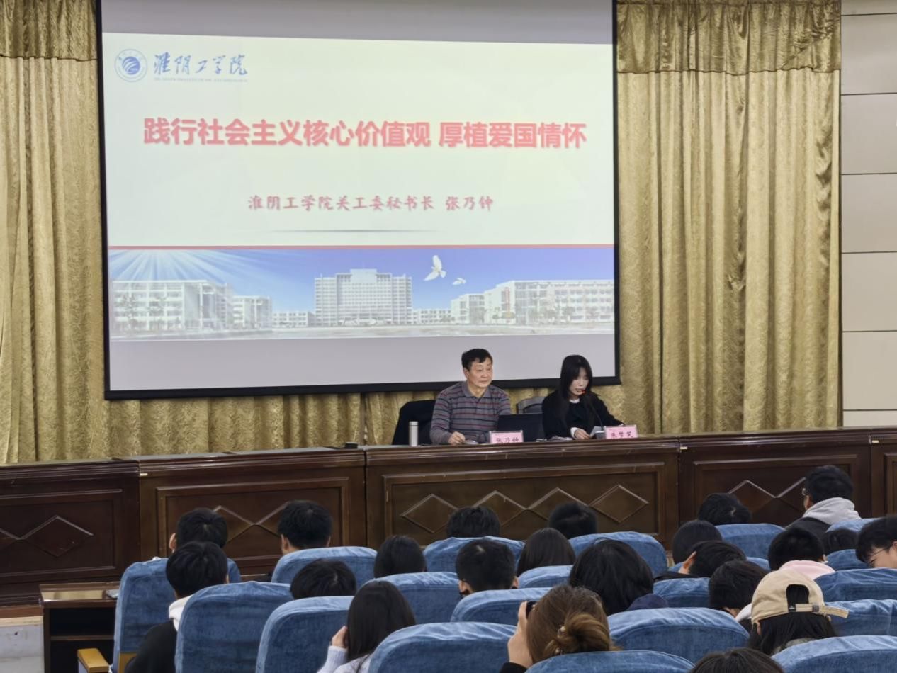 11月3日晚,电信学院在图书馆报告厅组织开展“践行社会主义核心价值观,厚植爱国情怀”主题团课活动。本次讲座由淮阴工学院关工委秘书长张乃钟担任主讲,青马工程培训班全体成员参加。