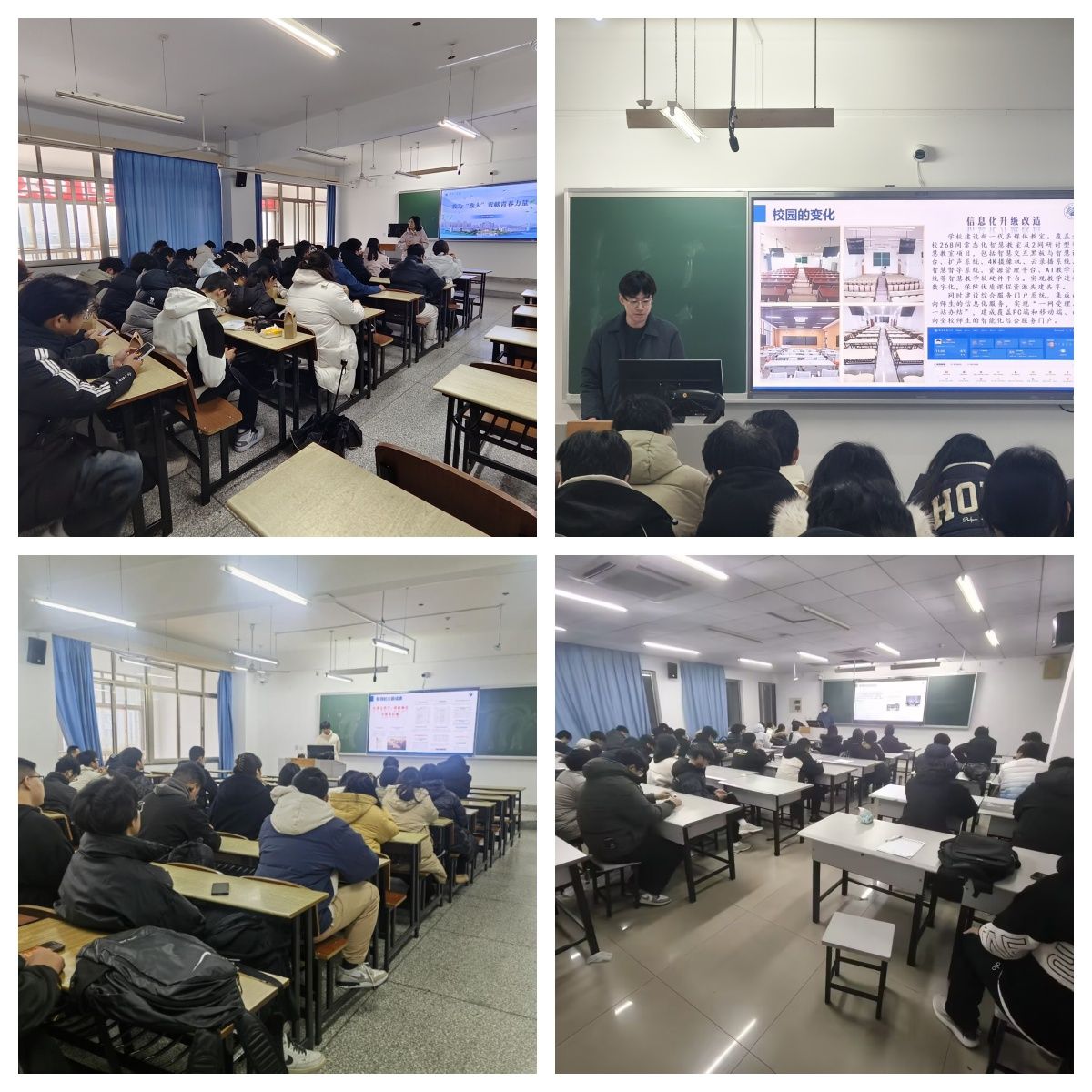 各班围绕“爱校荣校”主线展开分享。班主任们通过图文展示,回顾学校在学科建设、科研创新、人才培养等领域的发展成就,学校建设成果与发展前景,让同学们深刻认识到个人成长与学校发展的紧密联系。交流环节中,学子们结合专业特色,畅谈如何以实际行动为学校建设添砖加瓦——有的同学计划积极参与电子设计竞赛、智能车大赛等科创活动,以专业成绩彰显学校育人成效;有的同学表示将主动投身志愿服务,传递电信学子的责任担当;还有同学围绕学风建设、科研实践等提出合理化建议,立志以青春之力助力学校发展。