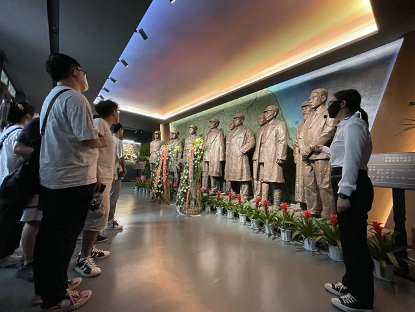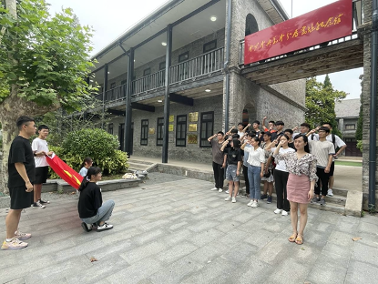 7月1日下午,全体支部党员在校门口集合前往中共中央华中分局旧址。一路上,同学们即兴唱起经典红色歌曲,各自分享一段熟知的党的故事,展现了青年党员的活力及对党的热爱与拥护。进入场馆后,学生党员们通过一件件珍贵的文物实物、一幅幅鲜明的新旧对比场景、一份份详细的档案资料,回顾中国共产党1945-1946年在淮安的光荣历史和辉煌成就。站在鲜艳的党旗下,支部书记潘丽带领全体党员庄严地高举右手,重温入党誓词、追忆入党初心,用铿锵有力的誓词表达了对党最强烈的热爱。