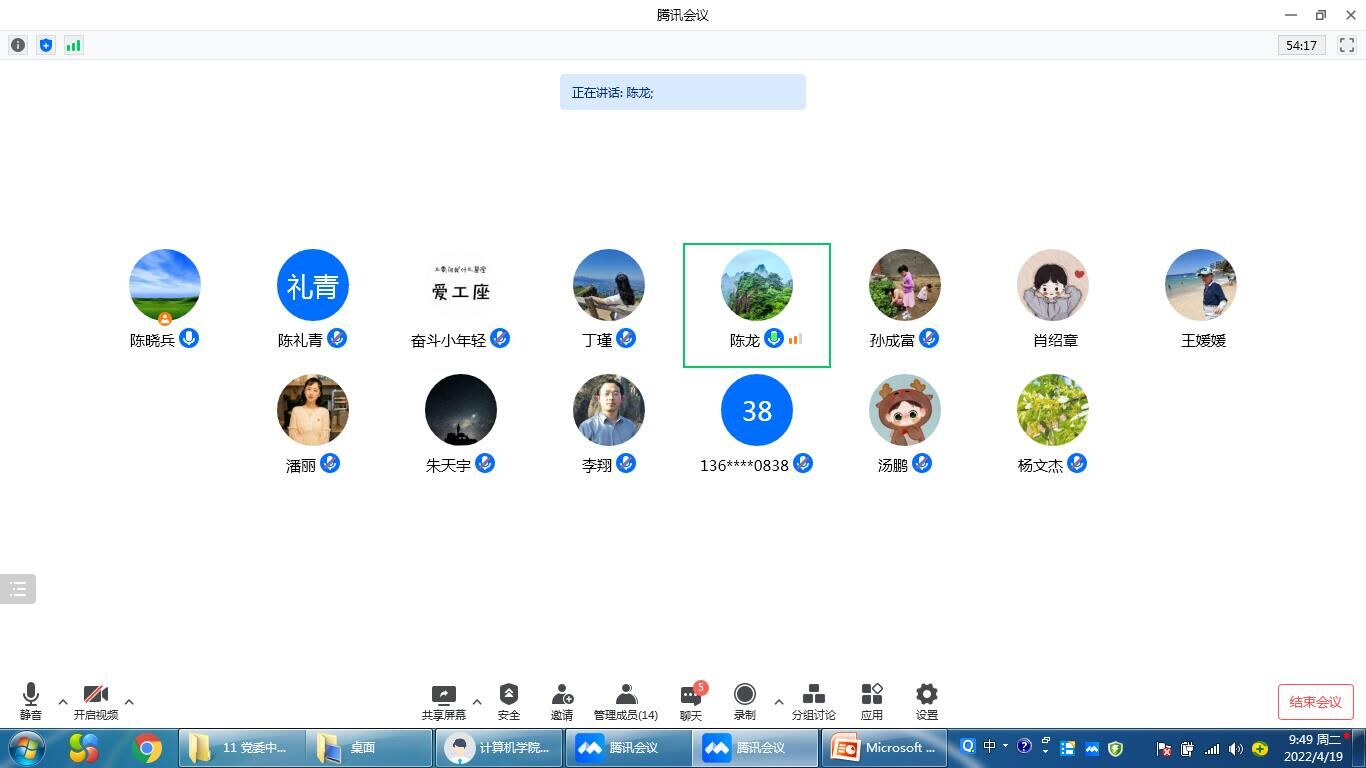 4月19日上午,计算机与软件工程学院在线上召开党委理论中心组会议,学院中心组全体成员参加会议,院党委书记陈晓兵主持会议。校巡学旁听专家陈龙同志旁听列席本次会议。