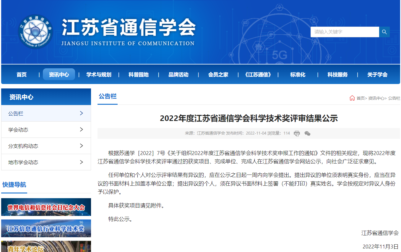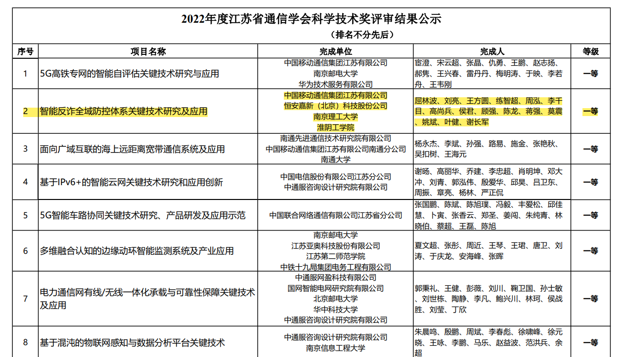 2022年11月10日,江苏省通信学会发布《2022年度江苏省通信学会科学技术奖评审结果公示》结束,我校计算机与软件工程学院周泓等教师参与研发的“智能反诈全域防控体系关键技术研究及应用”项目,荣获科学技术奖一等奖。