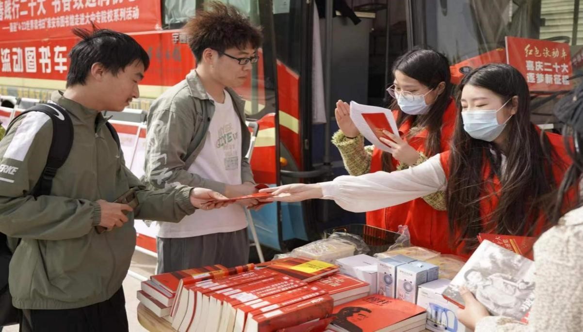 活动现场,志愿者向大学生发放“党的二十大报告速览”宣传册,组织大学生观看“贯彻新思想 创造新辉煌——全面深入学习贯彻党的二十大精神展览,开展党的二十大知识有奖竞答、红色书籍展等阅读推广活动,将全民阅读与党的二十大学习教育相结合,有力推动党的二十大精神在师生中落地生根。