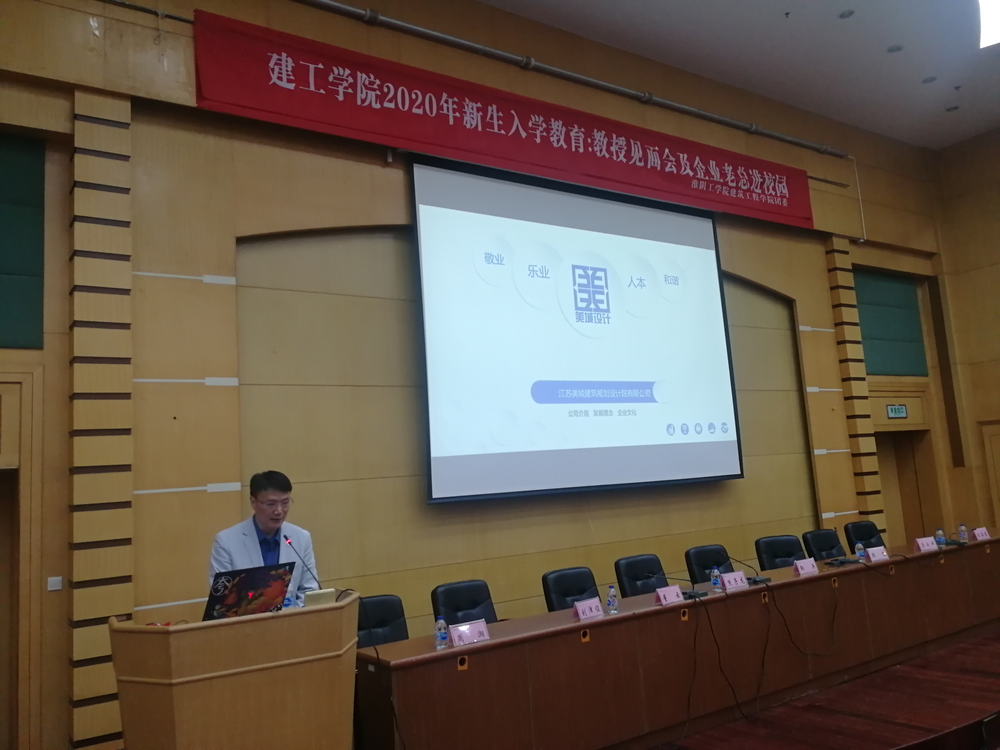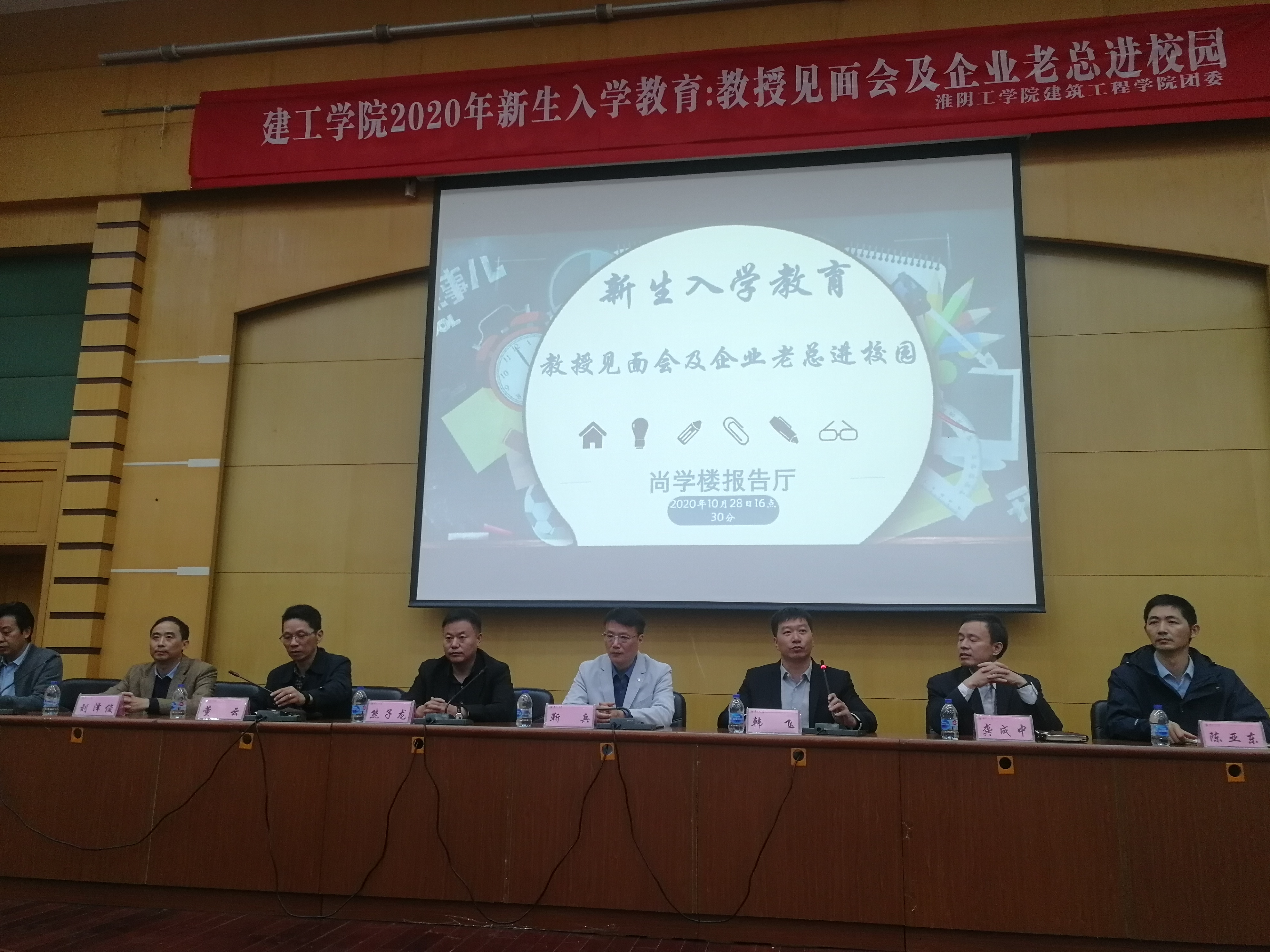 建工学院于10月28日下午4点30分,在北京路校区尚学楼报告厅开展建工学院2020级新生入学教育:教授见面会暨企业老总进校园。出席此次活动的有恒龙集团创始人、总经理熊子龙、美城规划设计院董事长靳兵、建工学院党委书记韩飞、院长董云、副书记副院长陈亚东、副院长周潮、龚成中教授、刘择俊教授。2020级辅导员冯云平以及2020级新生参加了本次活动,活动由党委书记韩飞主持。
