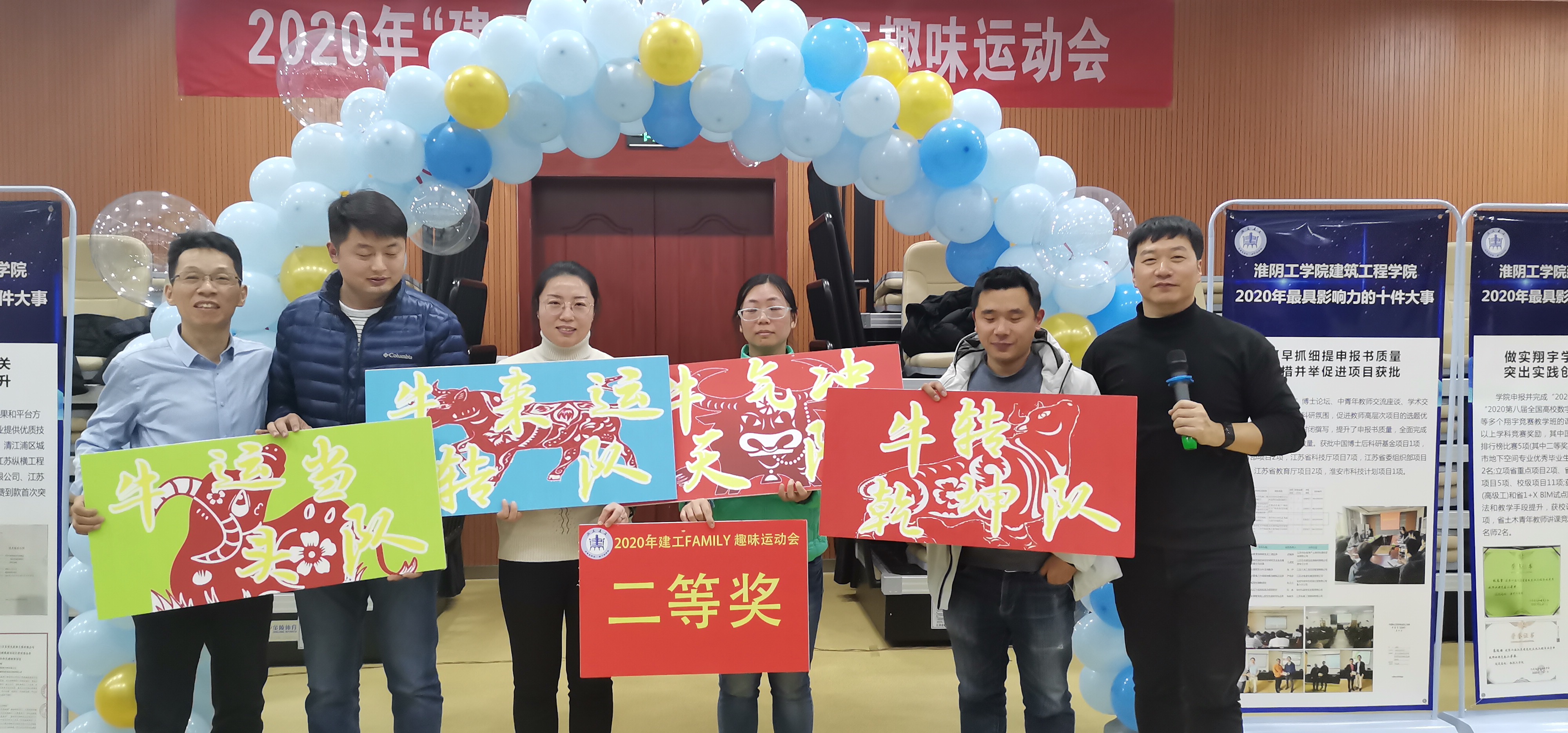 建工学院分工会主席王成武为7支参赛队伍:牛气冲天队、牛转乾坤队、牛来运转队、气吞牛斗队、壮气吞牛队、牛运当头队、建工外援队介绍了本次趣味运动会的项目和规则, 6个项目分别是:欢乐夹球跑、袋鼠跳跳乐、幸福对对抛、一箭见真情、真爱永流传、金牛行大运。