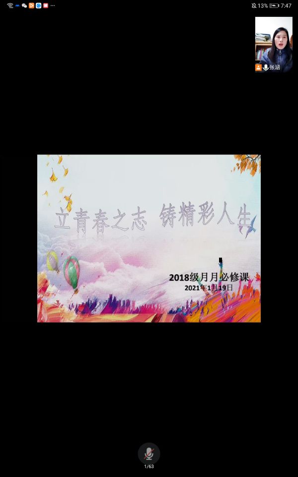 2021年寒假是一个较长的寒假,是学生查漏补缺的重要时期、也是培养自主学习能力的黄金阶段。建工学院于1月19号晚7:30在线上召开了2018级月月必修课“立青春之志,铸精彩人生”。会议由2018级辅导员张涵主讲,2018级全体学生参加了本次会议。