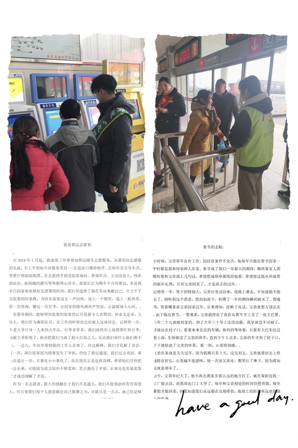 来自土木1181班的唐洲洋同学自2019年开始,连续三年参加春运暖冬行动,他用文字分享了作为一名春运志愿者的难忘经历。他说:“春运难曾困扰归家似箭的返乡人,一票难求,行李繁多,作为青翼子志愿者队的一员,我自愿加入车站工作人员的队列,为返乡旅客送上一句祝福,递上一杯热茶,搬运一次行李,做一些力所能及的事情。赠人玫瑰,手有余香,营造‘平安春运、有序春运、温馨春运’,我们志在必行。”