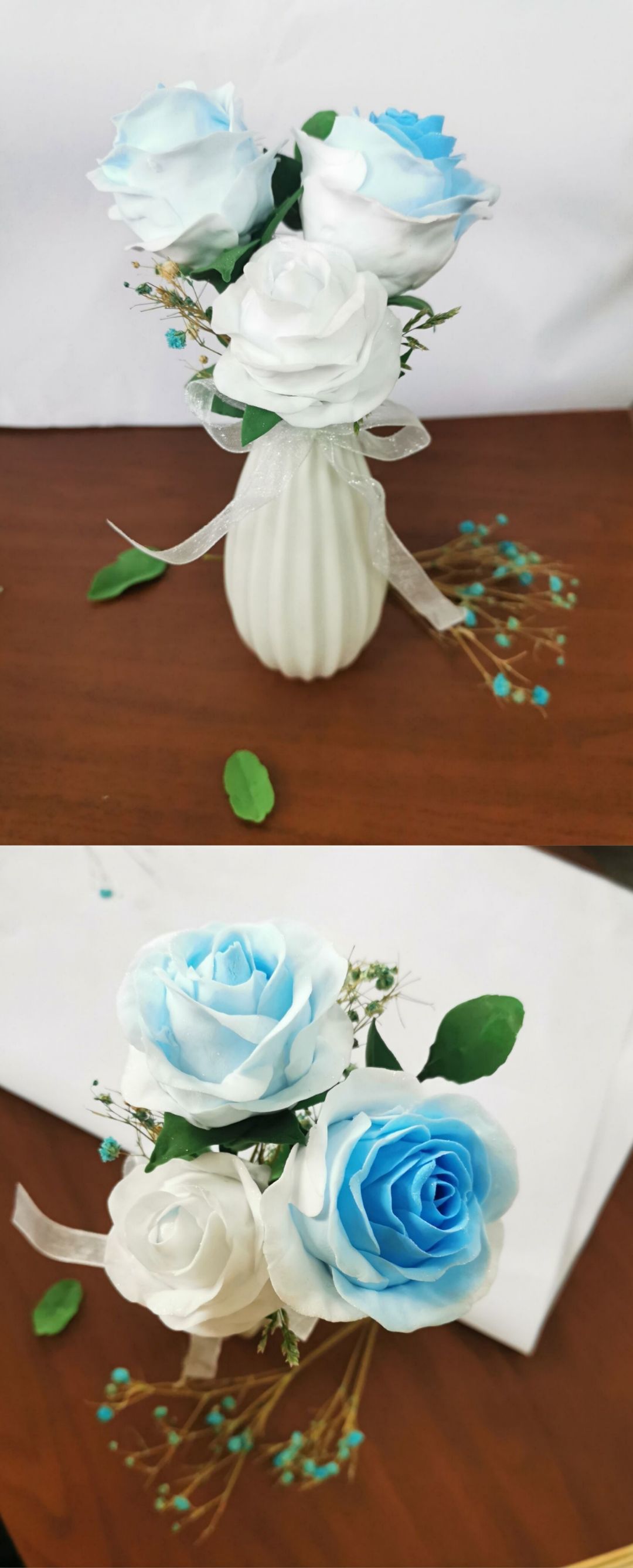 比赛现场同学们全神贯注,集中精神,沉浸在制作花的海洋里。规划1192班殷梦婷和王雅萱同学用粘土制作的蓝白色玫瑰花,素装淡裹,晶莹皎洁,亭亭玉立,看着它,总会情不自禁地产生出一种优雅素净的感觉;建筑1182班顾敏怡和李祝慧同学的作品,团簇在枝干之上的,是花朵的盛宴,珠光粉的点缀和太阳余晖的完美印衬,第一眼就令人如此难忘,迎面而来的,是春天的气息;更让人惊喜的,是建筑1192班汪灵和季诗薇同学变废为宝,将废旧口罩制作成一朵朵素雅的小蓝花——这既是对烂漫春天的歌颂,也是对抗疫的无声支持。同学们的用心和创意使每一朵花都拥有自己独特的精神。