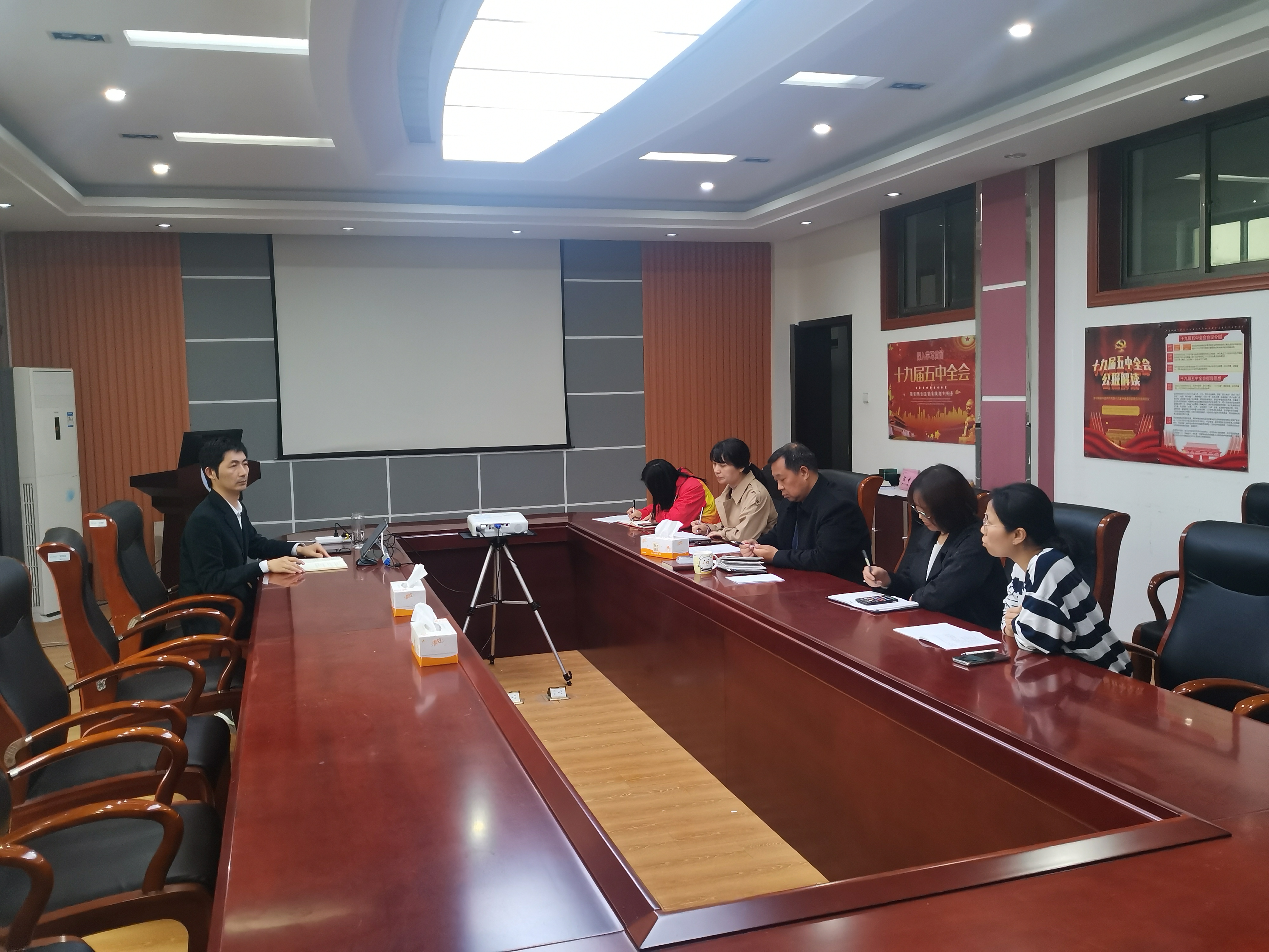 辅导员顾向阳老师对近期就业推进工作进行跟踪汇报,相约星期三专场招聘会有条不紊举行,对毕业班就业工作目前的形势和指标进度进行了分析,有方法、有经验、有责任、有落实。同时对考研学子的调档函、往届毕业生档案邮寄工作节点和流程进行了分享。