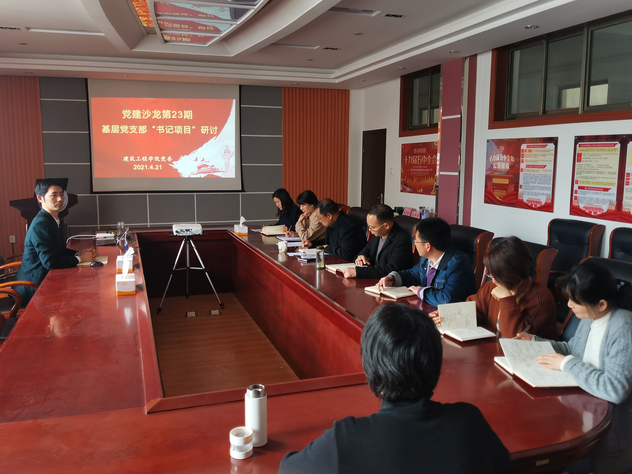 为推进基层党支部“书记项目”申报工作,2021年4月21日下午3点,建工学院在品学楼3316室开展第23期“党建沙龙”活动:基层党支部“书记项目”研讨,活动由学院党委书记陈亚东主持,党委副书记冯云平、党支部书记罗雅丽、张继华、顾向阳、张涵、孙华圣、朱叶以及党务秘书唐善婷参加沙龙活动。