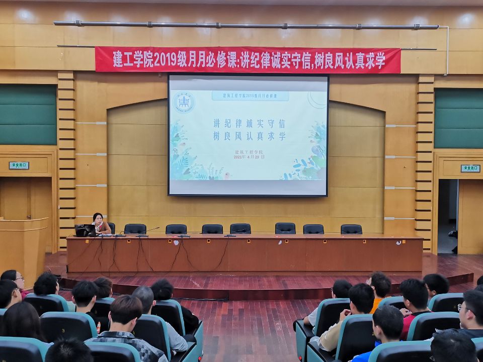 2021年4月29日下午5时40分,建工学院于尚学楼报告厅开展2019级月月必修课:讲纪律诚实守信,树良风认真求学。本次必修课由建工学院2019级辅导员周彤老师主持,2019级全体学生参加了此次必修课。