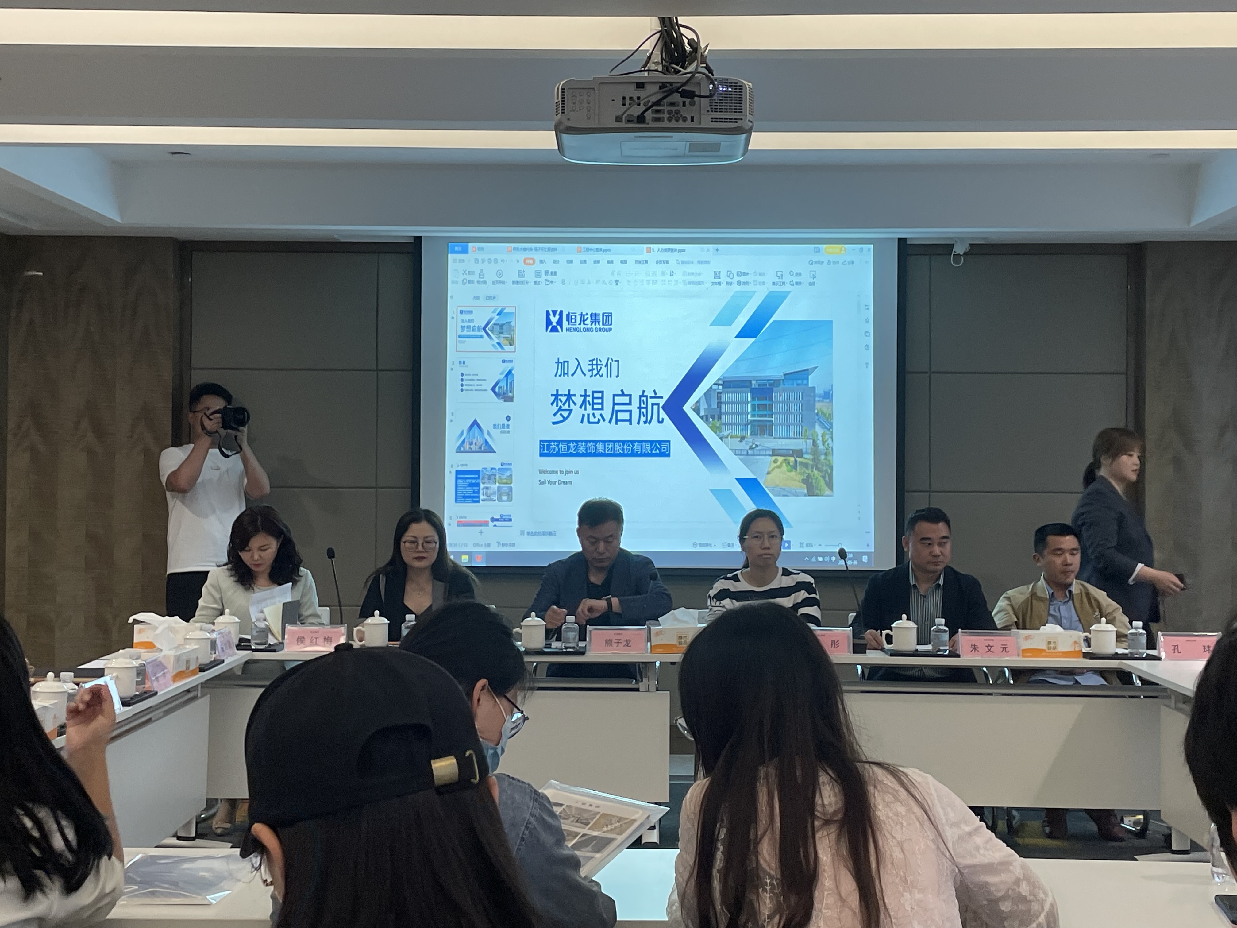 第二站来到了江苏恒龙集团。集团董事长熊子龙携高管团队及人力资源部全体人员热情接待了淮阴工学院的师生。集团商务副总经理侯红梅从发展历程、经营理念、价值观和企业文化等方面对公司做了详细介绍。集团商务中心经理唐志祥、工程服务中心经理刘连惠、设计院经理熊青就部门招聘、薪资待遇及晋升通道等方面做了详细介绍。集团董事长熊子龙指出,校企联合是企业反哺高校、推动高等教育事业发展的应尽责任,未来希望与淮阴工学院开展更深层次、更高水平的合作,培养出更多一流人才。最后,建筑系教师朱文元肯定了恒龙集团的实力、影响力和良好的口碑,希望校企双方在产教融合、协同育人的过程中探索出更多可复制、可推广的新模式。