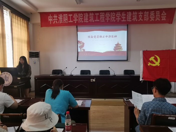 会议由支部书记顾向阳主持,顾向阳老师宣读了整个会议流程,按照党员转正程序,由待转正预备党员依次进行PPT演讲,介绍自己一年预备期以来的个人情况,汇报完毕后,针对下面答辩小组或者其他党员提出的问题进行回答,然后由该同志的两位入党介绍人(或培养联系人)介绍该同志预备期间的表现情况,并由支部副书记李施胜代表学生建筑支部委员会报告该同志在预备期间的教育考察情况,然后与会党员发表意见,对待转正的13位同志能否转正进行充分讨论,最后由正式党员进行无记名投票。按此程序,最终接收13名同志为中国共产党正式党员。