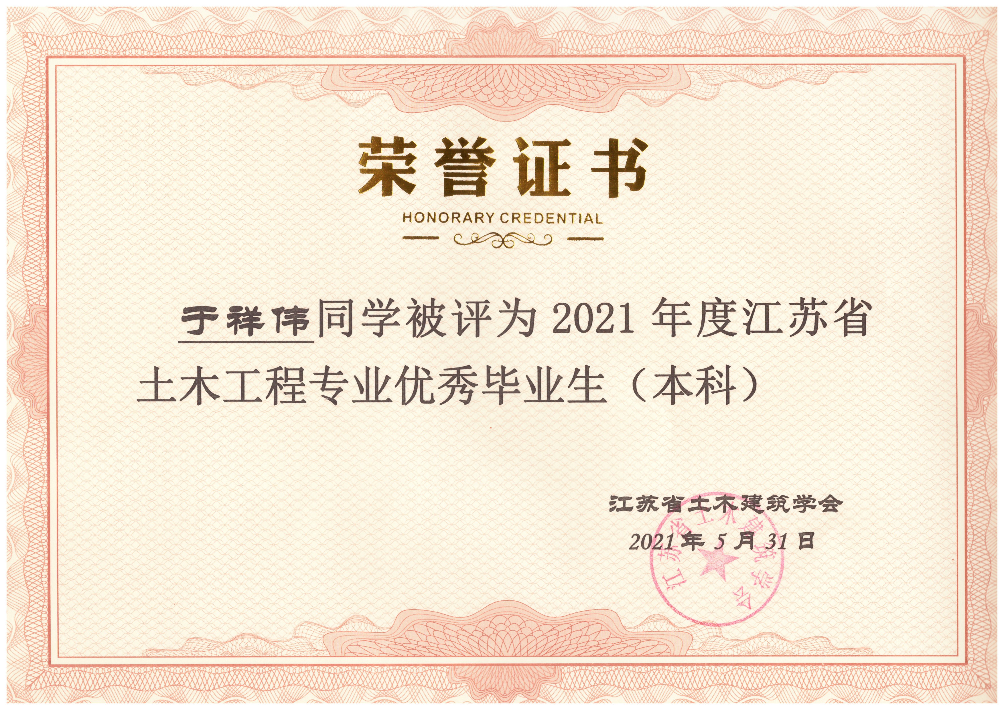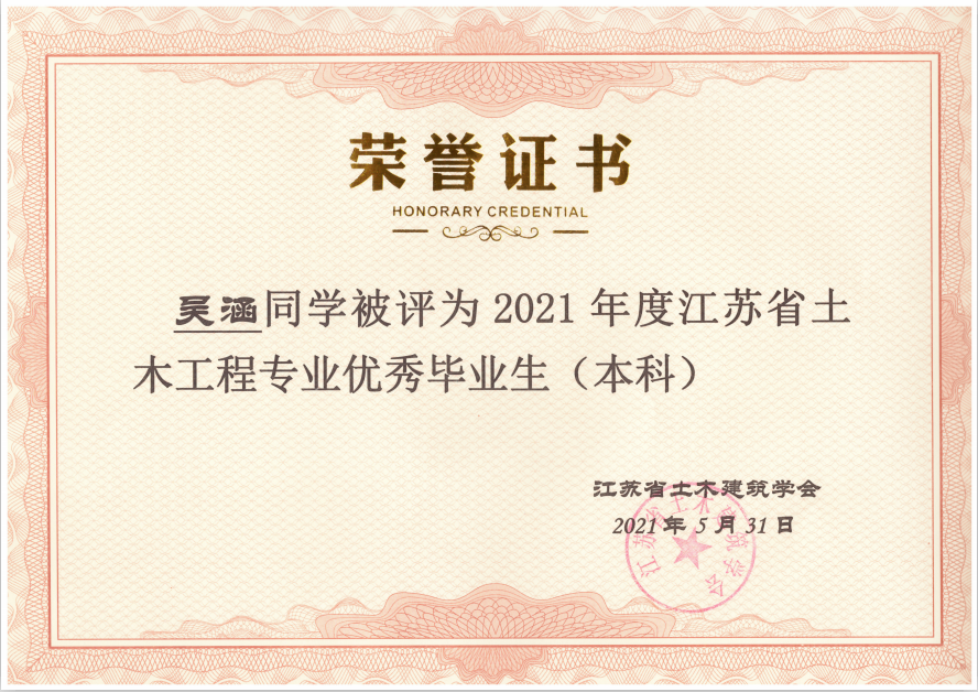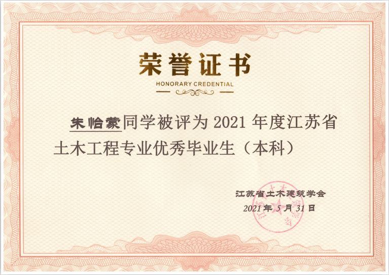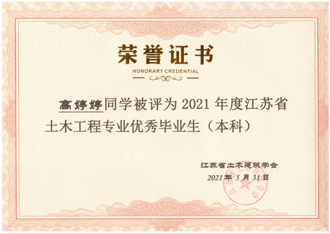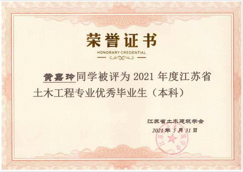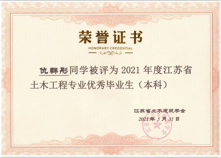 据悉,“江苏省土木工程专业优秀毕业生”评选是中国土木工程学会教育工作委员会江苏分会每年的重要活动之一,由江苏省各土建类高校推荐、中国土木工程学会教育工作委员会江苏分会组织专家评审,旨在表彰主修土木工程专业(包括工程管理专业)品学兼优的高校优秀毕业生。
