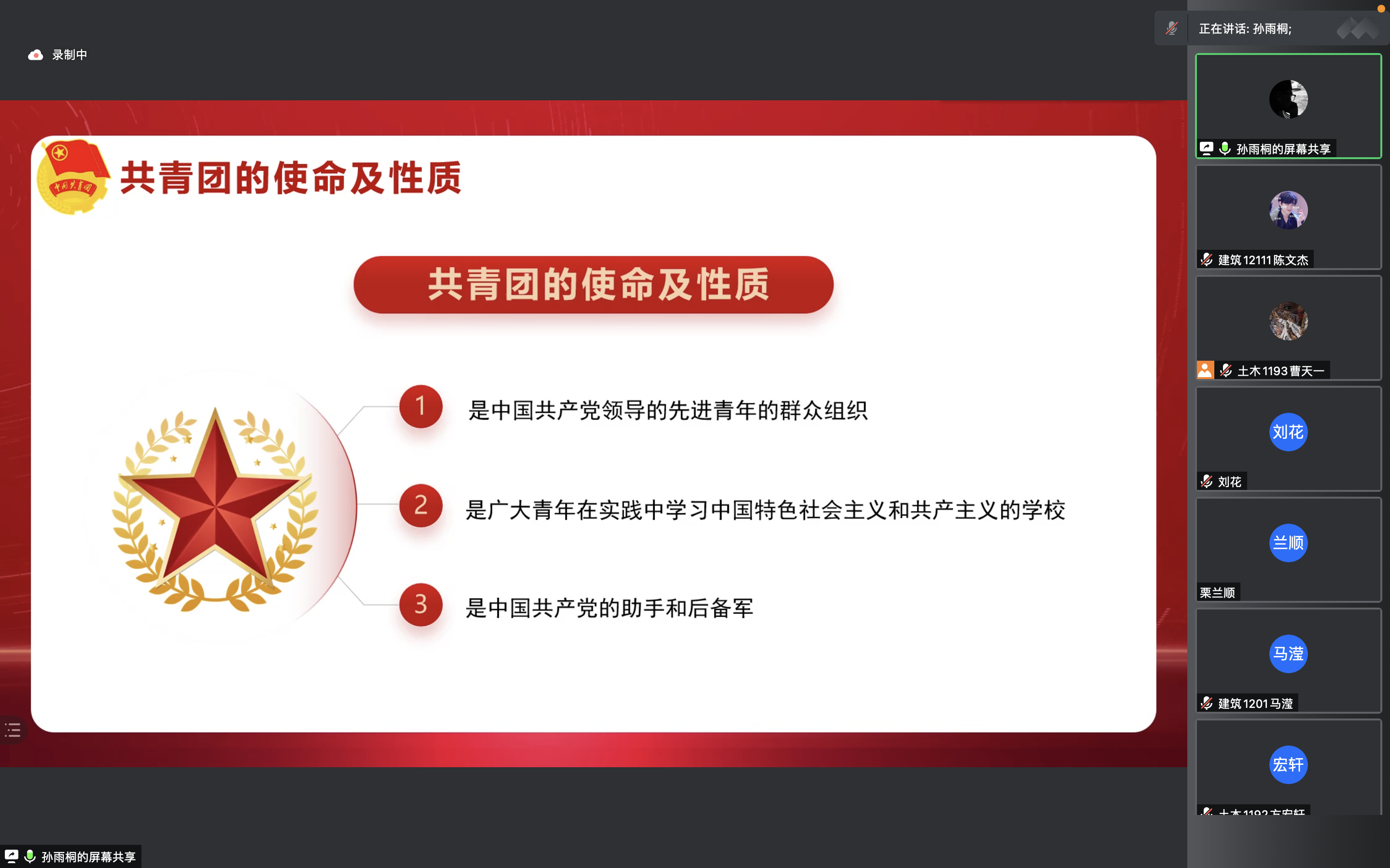 本期课程主题是“青春跟党走,建功新时代”。首先,孙雨彤老师从“新时代青年的使命是什么”引入,强调中国共青团是中国共产党的助手和后备军,共青团员更应起模范带头作用,坚持党的领导,学习习近平总书记重要讲话思想,坚持“三个必须”,不辜负党的重托和期望。其次,孙雨彤老师指出当代青年应该主动接下革命的接力棒,坚定马克思主义信仰,紧跟中国共产党的脚步,矢志学习,为建设中国特色社会主义而奋斗。最后,孙雨桐老师分别对各年级的学生提出要有未来的规划目标,要不断提升自己,并强调“空谈误国,实干兴邦”。