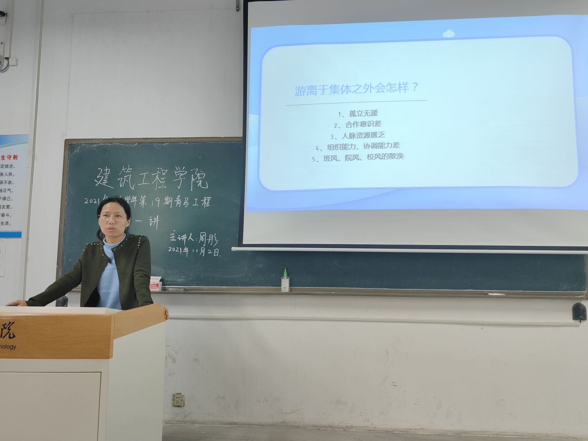 为了进一步增强学生对集体概念的理解,促进学校内集体的和谐发展,2021年11月2日12时10分,建工学院开展举办了第十九期青马工程公开课第一讲。本期课程由学工办主任周彤老师主讲,2018、2019、2020、2021级共63名同学参加了此次课程。