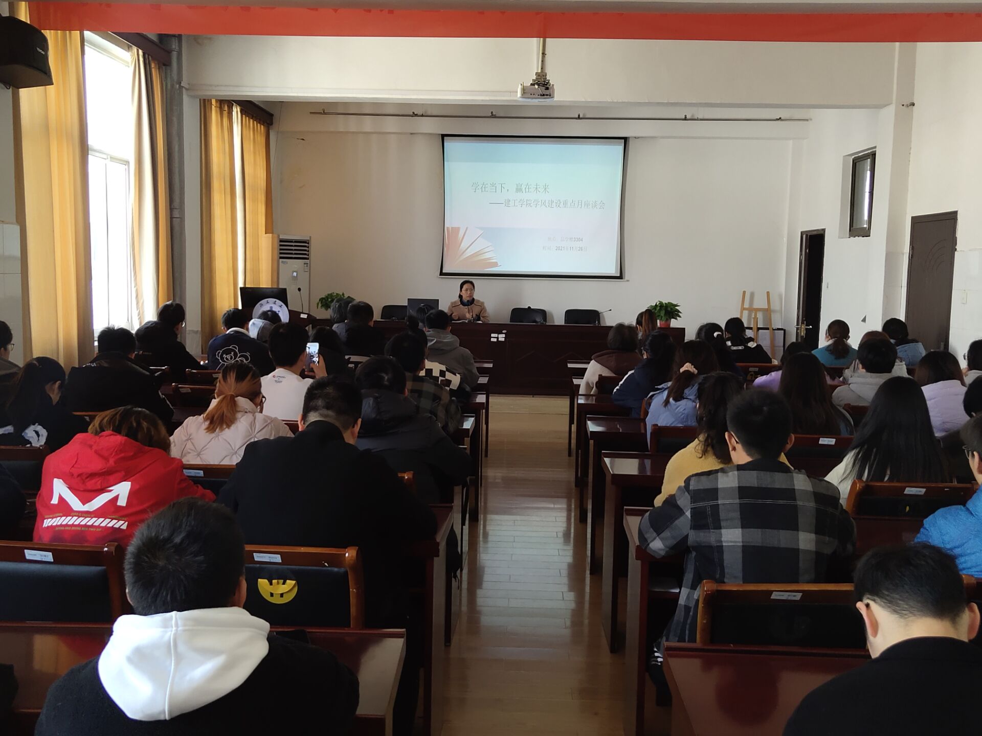 2021年11月26日中午12点30分,建工学院学风建设重点月座谈会在品学楼3号楼3304报告厅如期开讲。本次座谈会的题目为“学在当下,赢在未来”,主讲人为建工学院学工办副主任周彤老师,建工学院各班学习委员参加了本次座谈会。