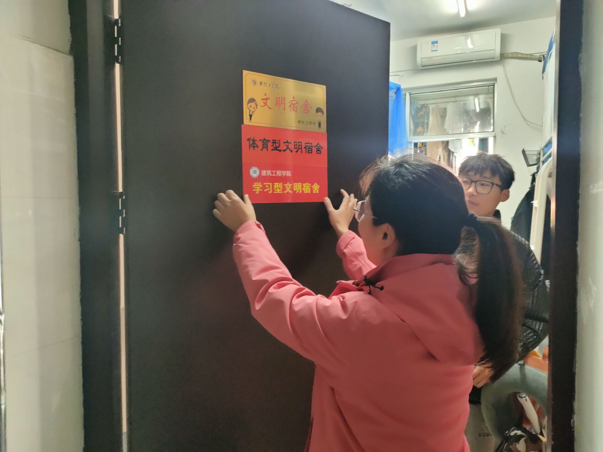 顾向阳老师宣读了各年级的获奖宿舍名单,共选出五类文明宿舍,共计40个。周彤老师对安全文明卫生宿舍环境的意义,宿舍存在夜不归宿、私拉乱接等宿舍安全问题进行总结。随后,顾向阳老师与周彤老师一起为获奖宿舍学生代表颁发了奖品和奖状,对他们表达了诚挚的祝贺并一同前往获奖宿舍举行挂牌仪式。