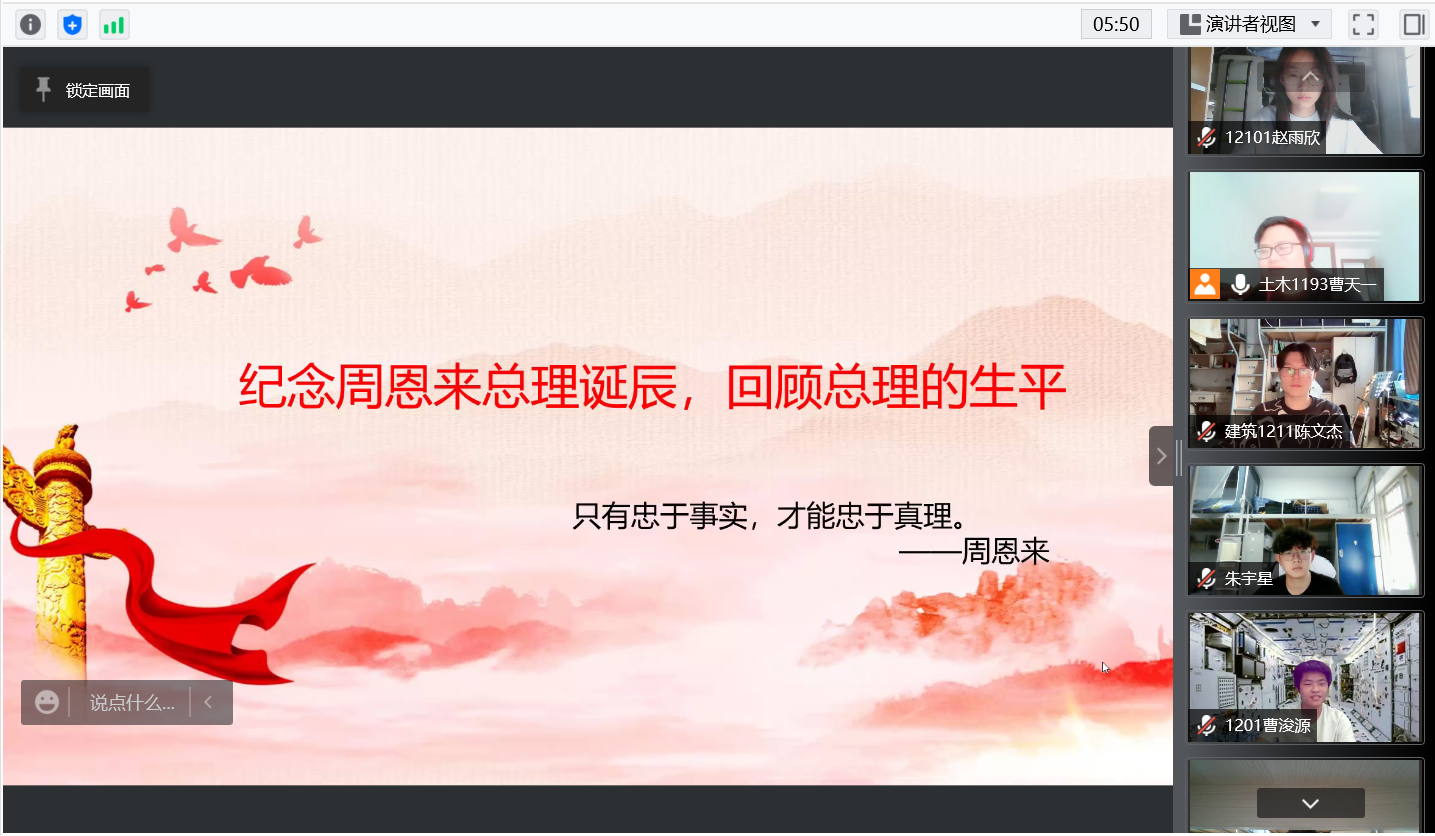 2021年3月5日,为纪念周恩来总理诞辰124周年,本着传承恩来精神,构建文明校园的宗旨,建工学院依托腾讯会议平台在学院学生中开展了线上学习活动。通过在线观看《周恩来外交风云》,及宣讲解读《回顾青年时期的周恩来总理》,深切缅怀周恩来总理。