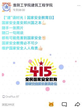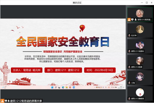 国家安全是头等大事!在“4·15国家安全教育日”来临之际,淮阴工学院建工学院团委通过召开主题班会、观看主题公开课、开展短视频线上接力活动等形式,组织开展2022年全民国家安全教育日主题团日活动,切实增强同学们的国家安全意识。