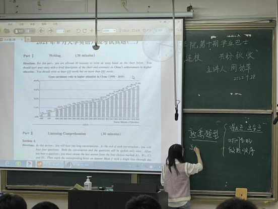 活动中,周劲草学姐总结并介绍了自己的复习方法,分享了她的做题技巧。周劲草向各位考生们介绍了四六级考试的题型,以及各个题型的得分点和失分点,她表示只有熟悉考试题型才可以更好的分配各个题型的做题时间以及做题顺序,这样才可以高效的得分。