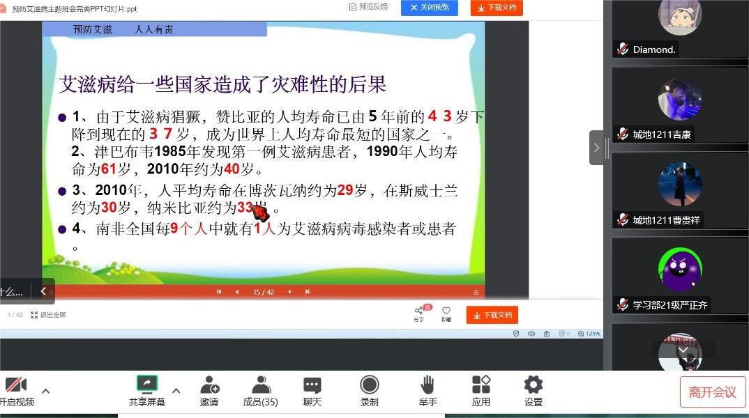 为进一步宣传预防艾滋病知识,增强学生的自我保护意识和能力,确保他们的身心健康和生命安全,12月6日,建筑工程学院组织21、22级各班召开艾滋病主题班会,班会采取线上方式进行。