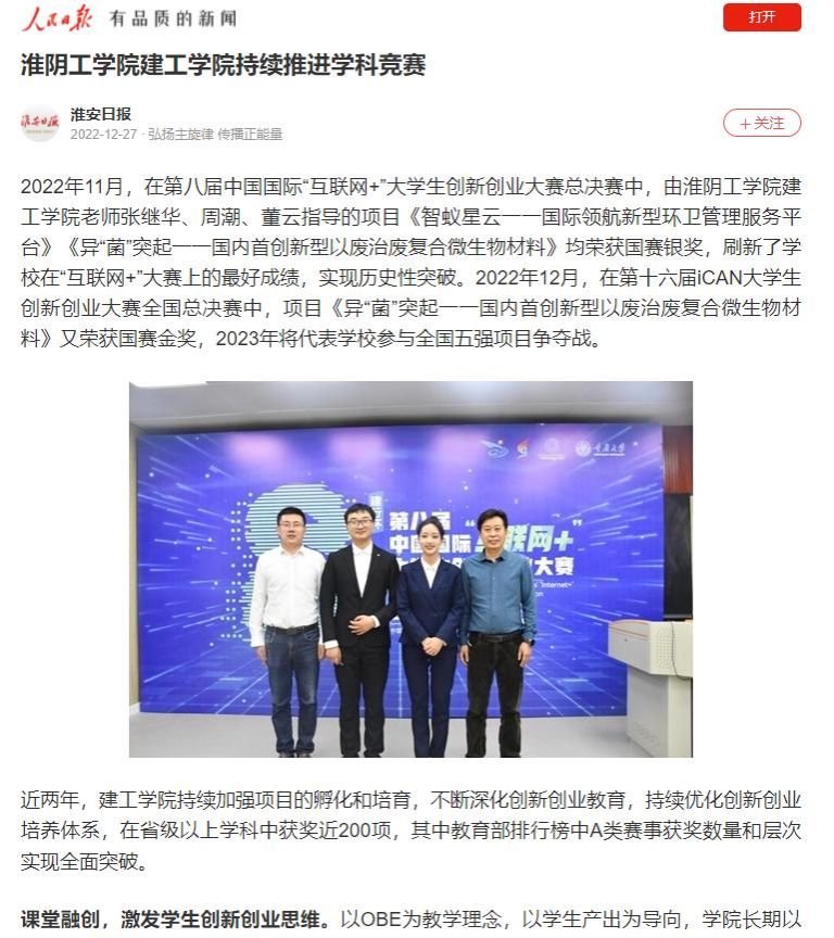 学院持续优化创新创业培养体系,激发学生创新思维,根据不同类别的竞赛,提前谋划,细致打磨,凸显示范引领,形成了教学与创新创业紧密结合、同向同行的现象。2022年,学院学生在省级以上学科中获奖超过90项,教育部排行榜中A类赛事获奖16项,数量和层次全面实现历史性突破。在第十六届iCAN中国大学生创新创业竞赛中获总决赛金奖,在第八届中国国际“互联网+”大学生创新创业大赛总决赛中获银奖2项,实现学校在该赛的历史性实破。