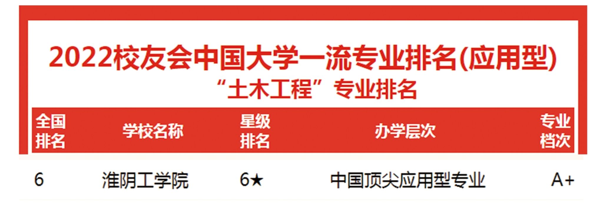 学院坚持以习近平新时代中国特色社会主义思想为指导,全面贯彻落实党的教育方针,聚焦立德树人,坚持内涵式发展,持续提升人才培养质量。在全院师生共同努力下,土木工程专业顺利通过中国工程教育认证,获批国家级一流本科专业建设点、江苏省品牌专业,专业建设实现历史性突破。2022校友会中国大学一流专业排名(应用型)“土木工程”专业排名全国第6,星级排名“6★”,办学类型:中国顶尖应用型专业,专业档次:A+。