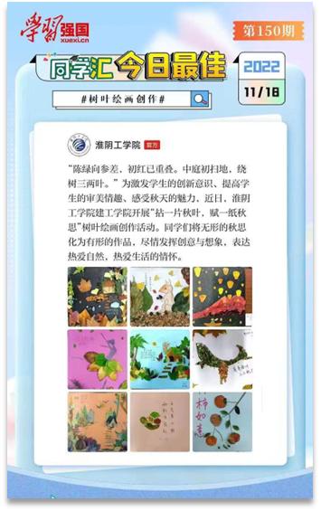 创建“云端加油站”线上平台,推送24期“党的二十大”拓展学习资料,打造“品学·思想荟”理论学习平台,邀请领导专家重点宣讲,通过手绘、海报等方式把深入学习宣传贯彻党的二十大精神有机融入专业教育。荣获“我们这十年”主题征文教师组唯一的一等奖。参加“喜迎二十大 逐梦向未来”优秀主题演唱作品征集,获得一、二、三等奖8项。获校廉洁文化活动周优秀组织奖,设计的廉洁海报获得一等奖。“拈一片秋叶,赋一纸秋思”树叶绘画创作活动被学习强国、江苏教育发布报道。