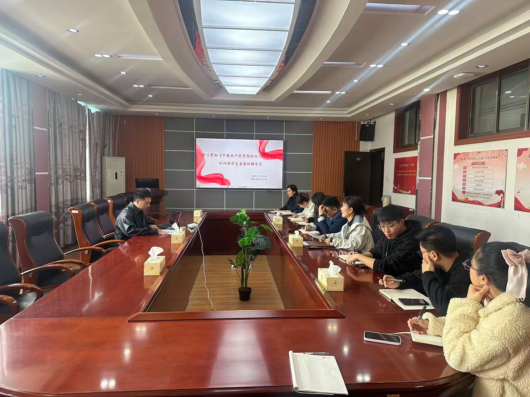 韩飞带领大家学习了《中国共产党思想政治工作条例》,他强调教育的本质是培养出自尊自信、理性平和、积极向上、具有开放包容积极心态的学生。他从“理论筑基”、“实践粹能”、“成长寻迹”、“云端绘制”四个方面阐述了如何做一名学生喜爱的辅导员,最终实现学生找到自己、成为自己的目标。