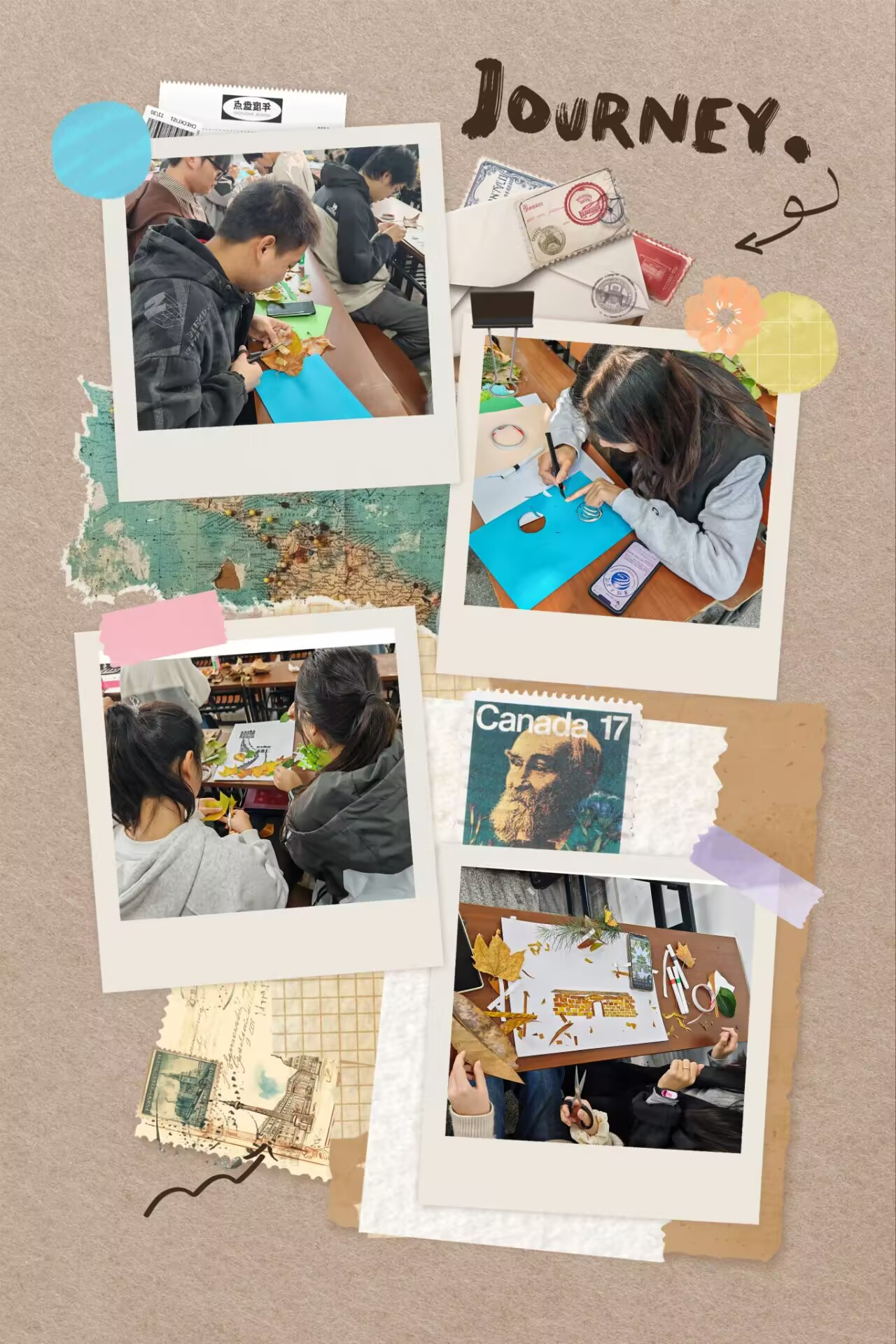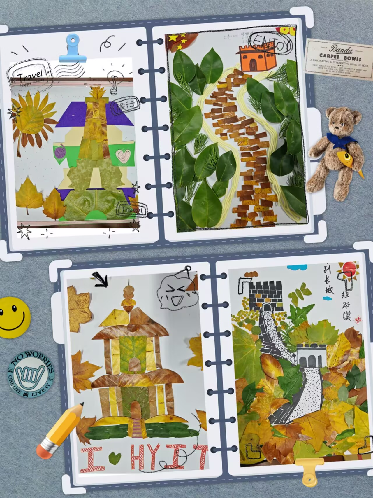 活动中,同学们以卡纸为“画布”,以落叶为“颜料”,通过剪裁、拼贴、层叠等手法,将一片片承载季节印记的树叶转化为一幅幅生动图景。周恩来纪念馆的庄重典雅、镇淮楼的古朴沧桑、万里长城的雄浑壮阔,均在同学们的巧手下得以再现,不仅传递出建筑的历史底蕴,更实现了自然之美与人文之思的有机融合。