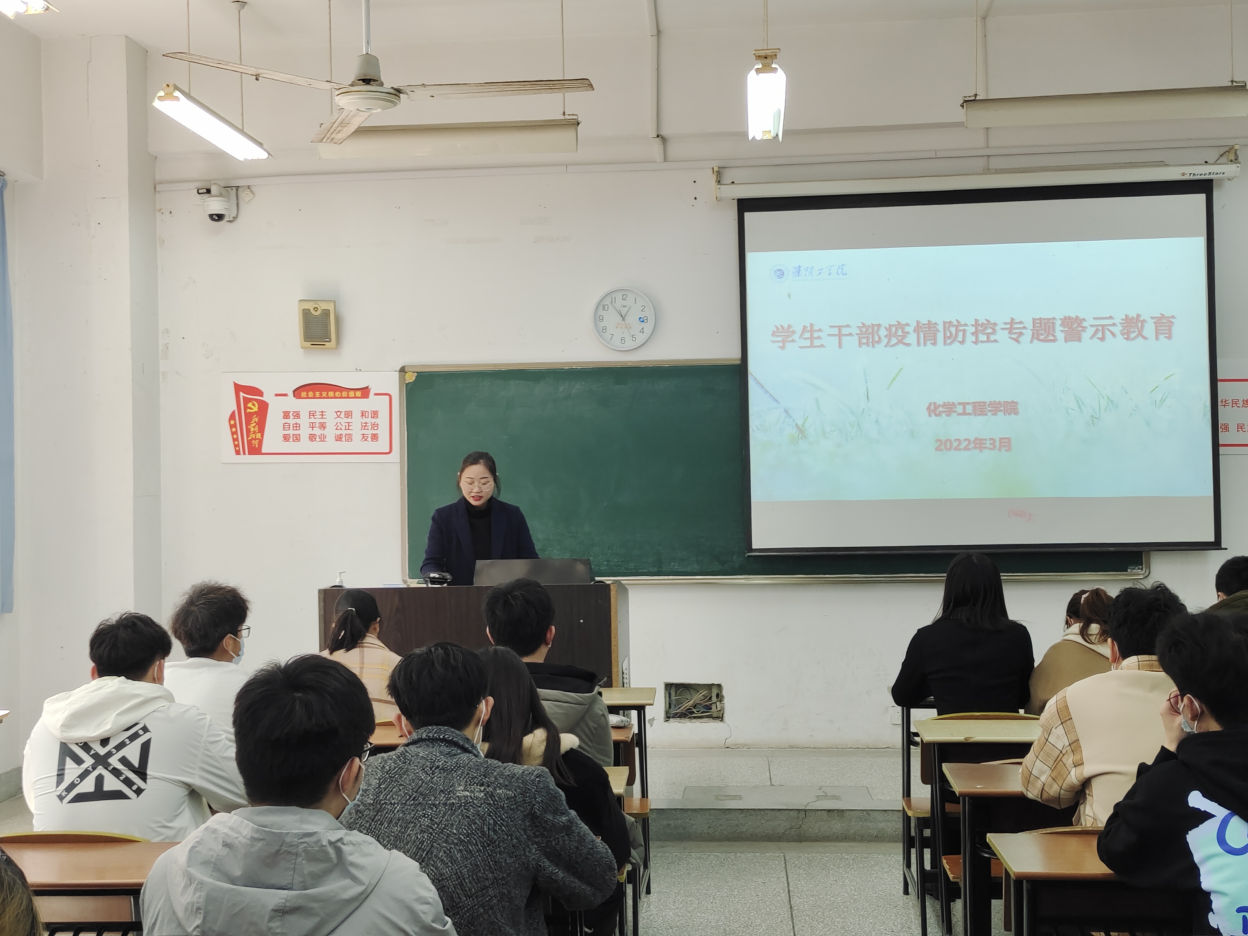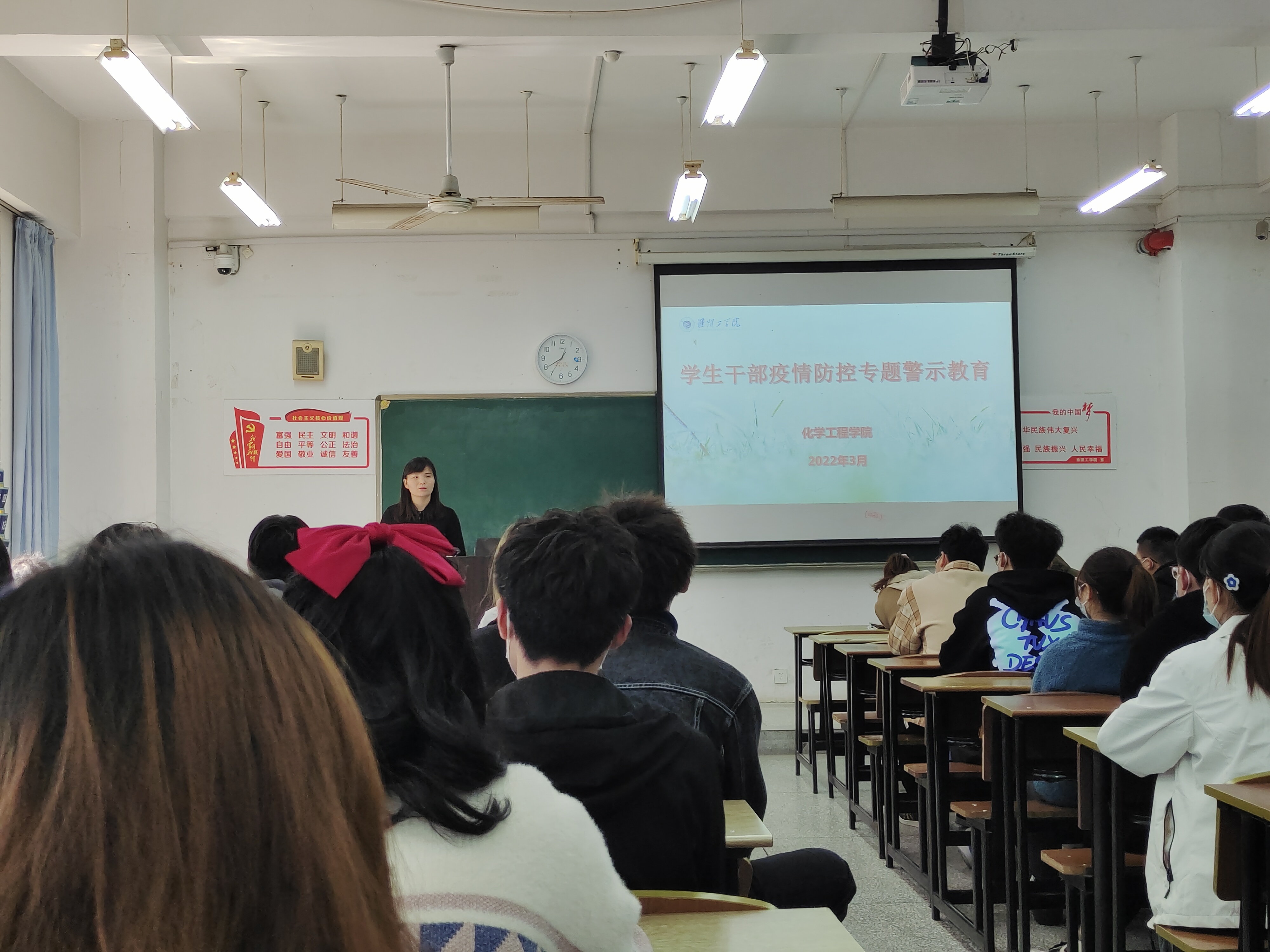 为进一步加强学生疫情防控意识,保障学生可以在一张严密的防控安全网中正常学习和生活,3月9日中午12:30,化学工程学院在21108举办学生干部疫情防控专题警示教育活动,出席本次活动的有学院党委副书记金娅琳,全体辅导员及学生干部。