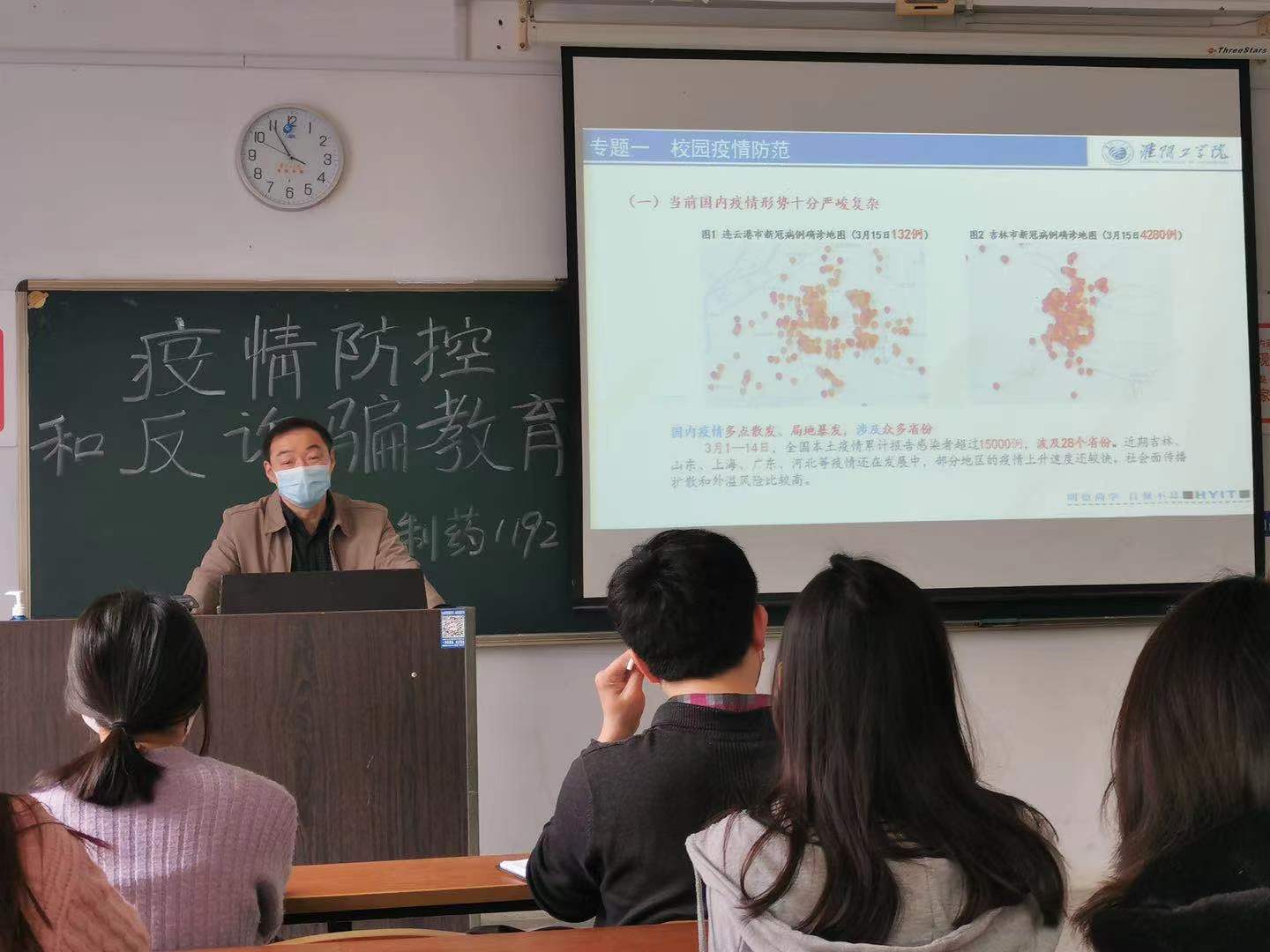为贯彻落实学校疫情防控相关部署和落实学校防范电信网络诈骗专题会议精神,维护校园安全稳定,2022年3月15日至18日期间,联系化工学院各班级的校科技处、社科处、高教所等14位中层领导干部深入学生班级,召开“疫情防控和防范电信诈骗”主题班会。