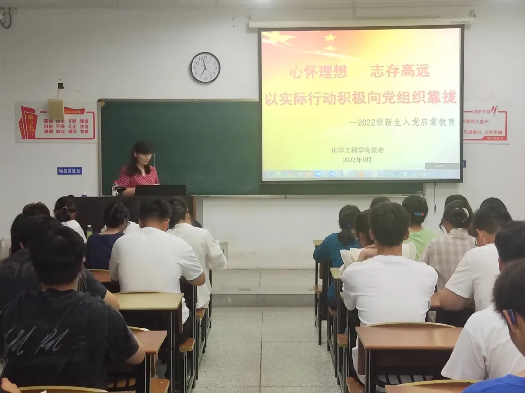 为帮助新生了解党组织,提高新生的入党积极性,化学工程学院于9月6日晚上19:00在21107教室对2022级新生进行入党启蒙教育,化学工程学院学工办主任陈晓娟以及2022级新生参加了本次活动。
