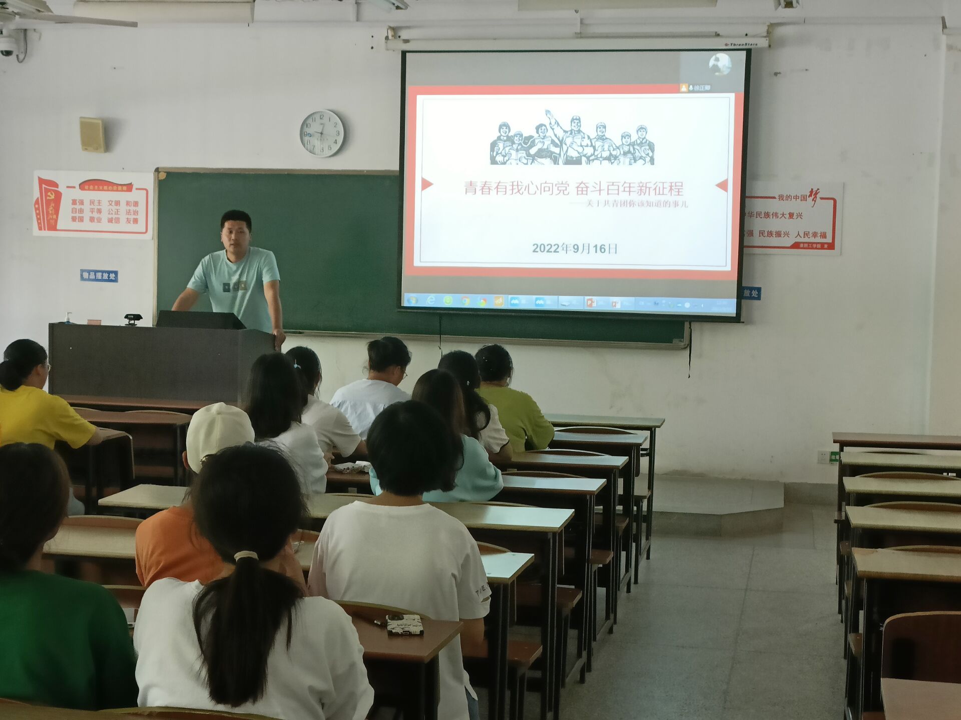 为帮助2022级的同学们更好的认识中国共青团,增强22级同学们入团、入党的积极性,做好22级新生的思想建设,9月16日中午,化学工程学院于21105教室组织开展“青春有我心向党,奋斗百年新征程”主题团课。参加本次活动的有化学工程学院2022级辅导员袁野及2022级全体同学。