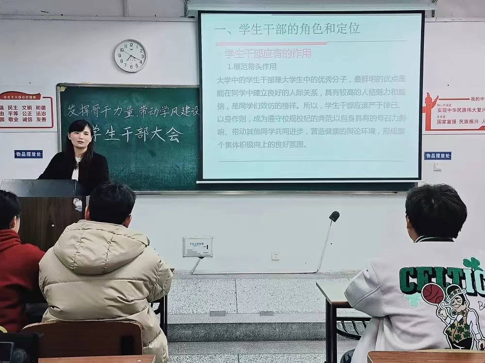 活动过程中,陈晓娟老师以“如何做一名学生干部?”和“如何做一名优秀的学生干部?”两个问题,层层递进,引起大家的思考。随后,陈晓娟老师通过对“如何做一名合格且优秀的学生干部?”这一问题的阐述,向大家讲述了一名合格的学生干部应当具备的素质。同时,陈晓娟老师还指出学生干部应该做好带头模范作用,并为学生干部提出了一些建议,包括明确做学生干部的目的、加强为同学服务意识、面对困难不要有畏难情绪等。活动最后,陈晓娟老师以“一年好景君须记,正是橙黄橘绿时。愿诸君共勉!”结束了本次活动。