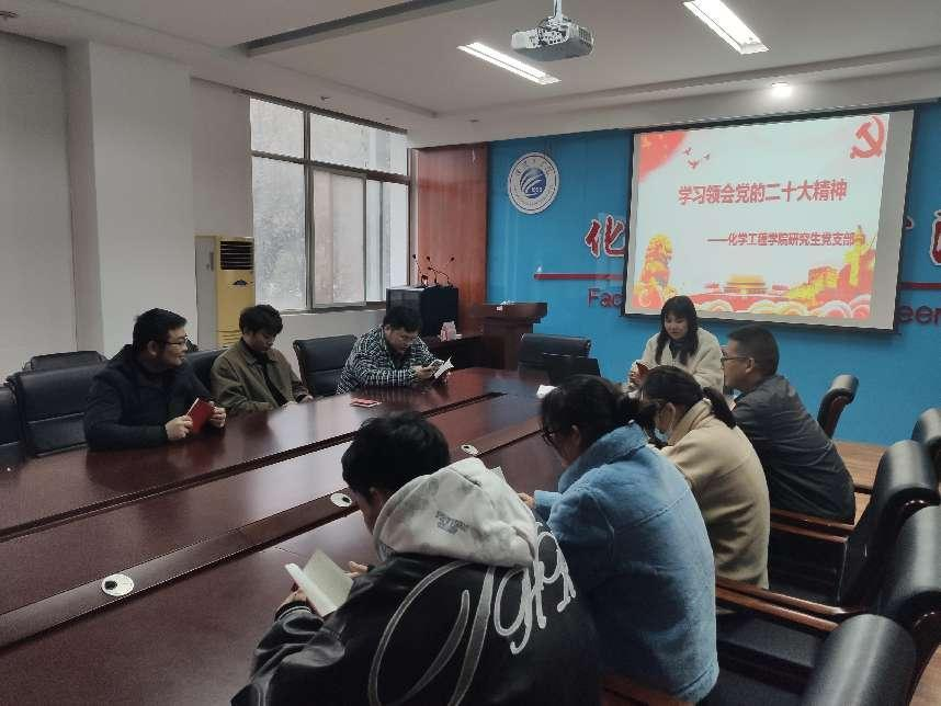 为深入学习党的二十大报告,深刻领悟党的二十大精神,11月18日下午,化学工程学院研究生党支部在21号楼104及26号楼211分别召开支部会议,专题学习了习近平总书记在中国共产党第二十次全国代表大会上的报告。研究生党支部书记胡婷婷主持会议。