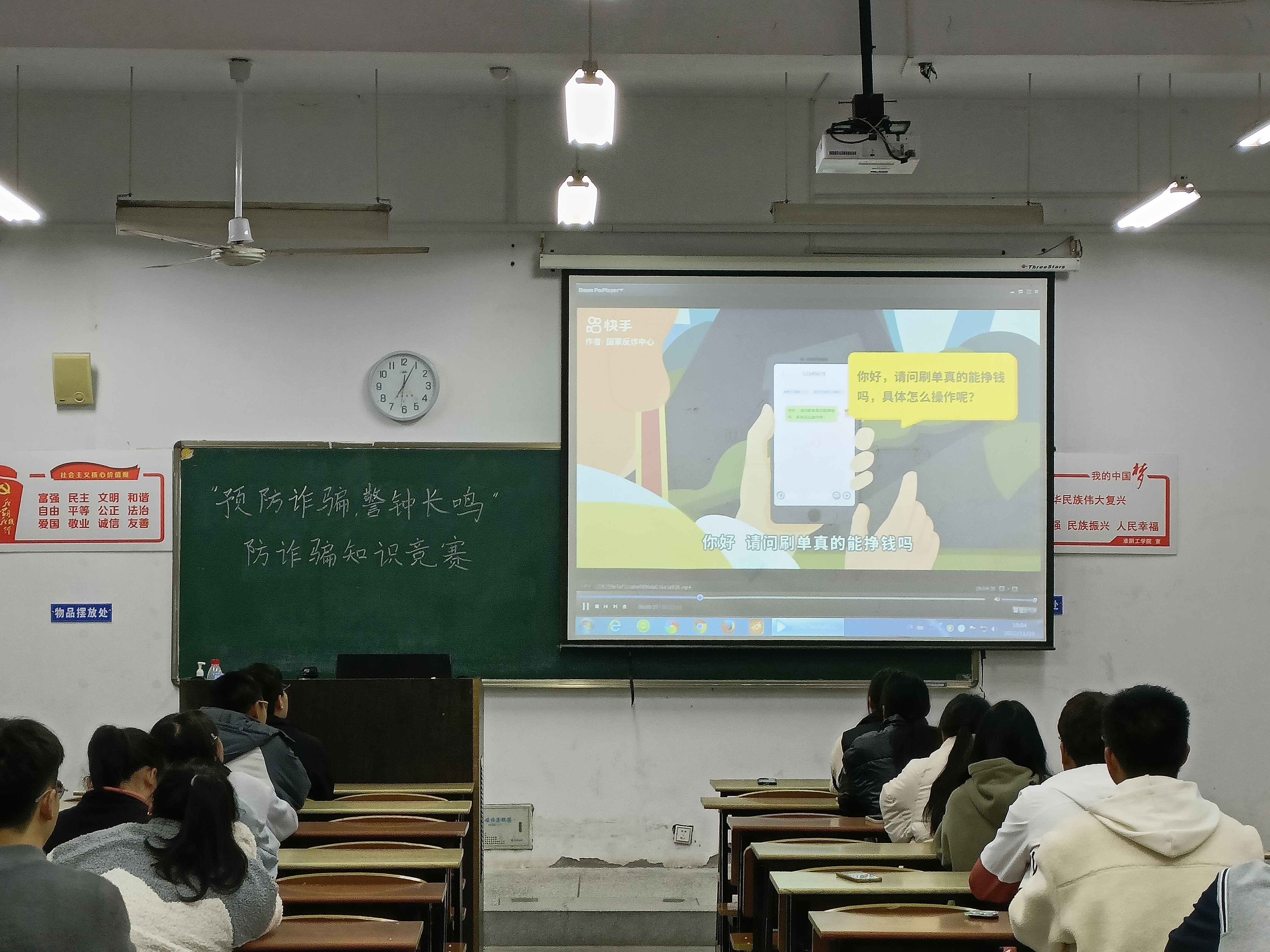11月19日晚,化学工程学院于21101、21104教室组织开展“预防诈骗,警钟长鸣”防诈骗知识竞赛,化学工程学院全体学生参加了本次活动。