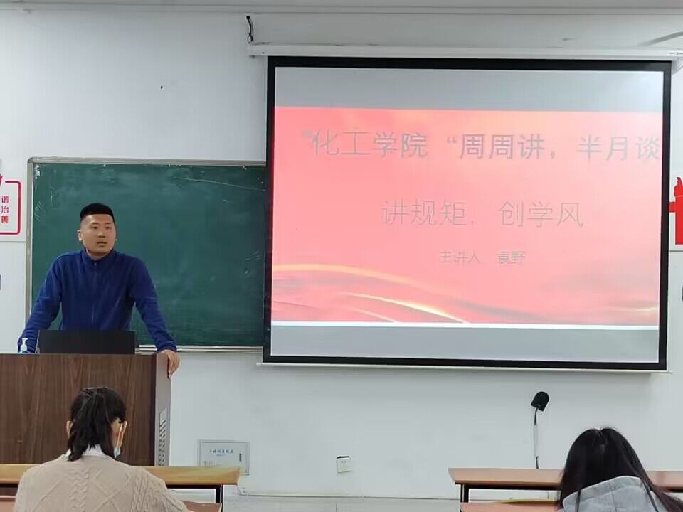 11月22日下午,化学工程学院于22108组织开展学风重点建设月之周周讲,半月谈——讲规矩,创学风活动。化学工程学院团委书记袁野、22级学生参与了本次活动。