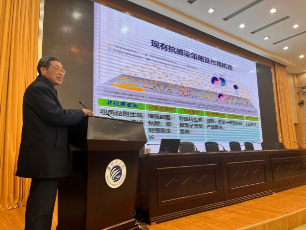 殷敬华研究员从医院及医疗器械相关感染现状以及医疗器械抗感染研究及现状分析总结该领域目前亟待解决的关键科学问题和技术瓶颈,全面介绍了其课题组近年来在留置与介入器械的抗菌和抗血栓领域的探索研究过程以及研究成果的产业化应用。殷敬华研究员的科研方向与我校多名老师的科研方向相近,在随后的交流环节中就抗菌医用材料研究过程中的具体问题进行解答和探讨,并表达了继续合作交流的愿望。本次报告具有非常高的理论深度,科研成果具有很高的理论引领性,现场师生的反响异常热烈。