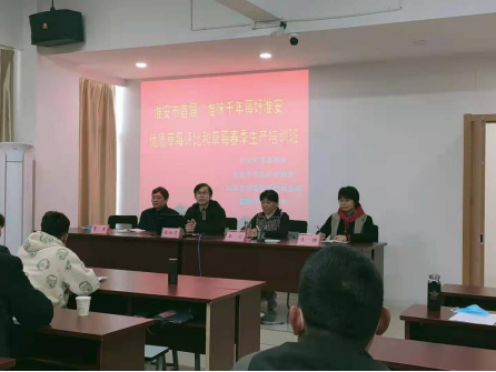 为了加强淮安市草莓生产企业、草莓种植户之间的交流,提高草莓种植水平,加强草莓品牌建设,扩大草莓影响,促进淮安市草莓产业健康发展,江苏省草莓产业体系盱眙推广示范基地联合淮安市草莓协会、淮安市农业品牌协会于3月14日举办了2021年度草莓春季生产培训暨淮安市首届“淮味千年·莓好淮安”优质草莓评比活动。江苏省草莓协会、江苏省农科院、淮安市农业农村局科教处和种植业处、淮安市园艺站、淮安市农业广播学校、金湖县农技推广中心、淮安市草莓协会、淮安市农业品牌协会、淮阴工学院生科院、淮阴师范学院生科院、淮安市农科院、淮安广播电视台等单位相关负责人和专家,盱眙基地和示范点骨干、草莓种植企业和种植大户代表100余人参加了活动。