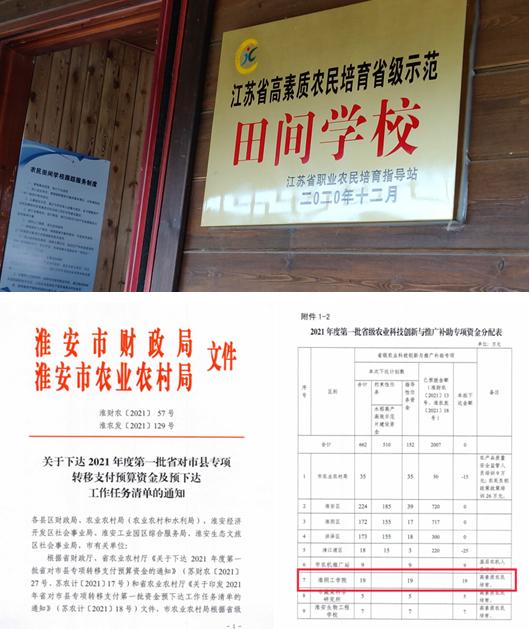 该项目列入江苏省农业科技创新与推广补助专项资金管理,2021年省级财政补助专项资金19万元。专项资金主要用于田间学校建设和高素质农民培育。
