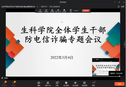 为进一步将防电信诈骗意识深入学生内心,3月4日下午,生科学院在钉钉会议上召开全体学生干部防电信诈骗专题会议。生科学院党委副书记、副院长夏雪芹,全体辅导员,全体在校学生干部参与会议。