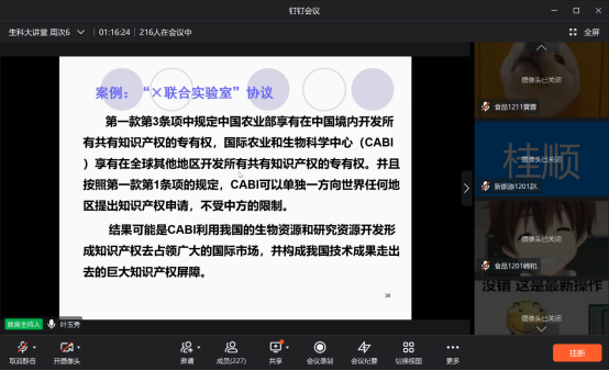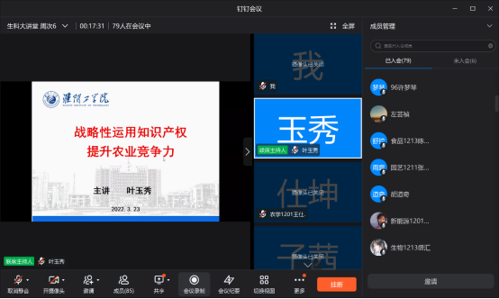 3月23日下午,生科学院于线上钉钉群开展了以“战略性运用知识产权提升农业竞争力”为主题的第一期生科大讲堂讲座。本期主讲教师为生科学院叶玉秀博士,生科学院部分学生参加了此次讲座。