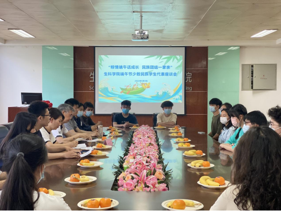生科学院从在校的近百名少数民族学生中挑选了壮、苗、侗、彝、瑶、满族等18位少数民族学生代表参加座谈。座谈会开始,学院就为他们发放粽子鸭蛋等并送上节日祝福。座谈会在轻松和谐的氛围下进行,同学们畅所欲言,聊民族习俗、聊地方特色、聊端午风俗等,兴致所至,彝族和水族的同学还用自己民族的语言表达“端午安康”等祝福语。周青教授仔细询问少数民族同学们在校学习和生活适应情况,并对他们提出合理的建议。余文冲介绍学院在培养少数民族学生取得的成绩并就下一阶段学院对于少数民族学生制定的特色培养项目简要说明。