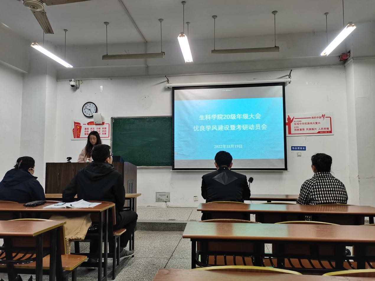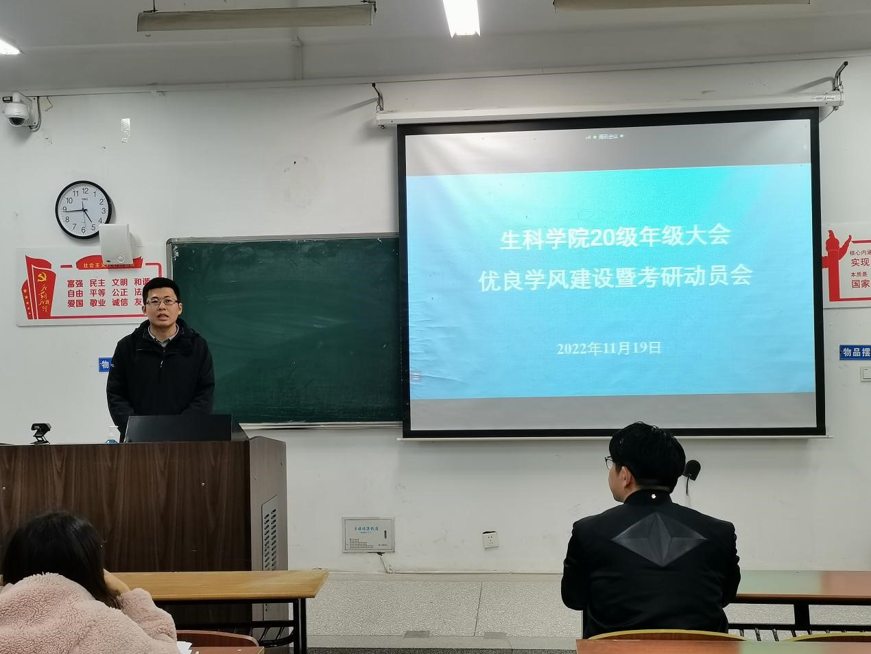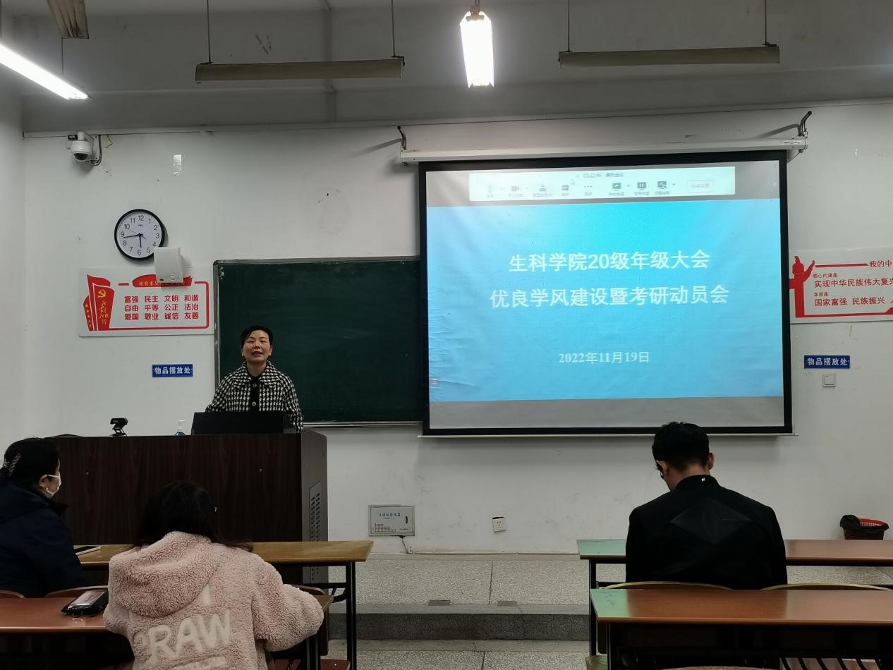 为进一步加强学院优良学风建设,提升考研促学风的引领作用,11月19日下午4:30,在22号楼108等教室召开生科学院2020级优良学风建设暨考研动员会。院党委副书记、副院长夏雪芹,学工办主任余文冲,2020级学生辅导员张爱芳以及全体2020级学生参加本次会议。会议还特别邀请考研名师米雷老师做考研专题讲座。