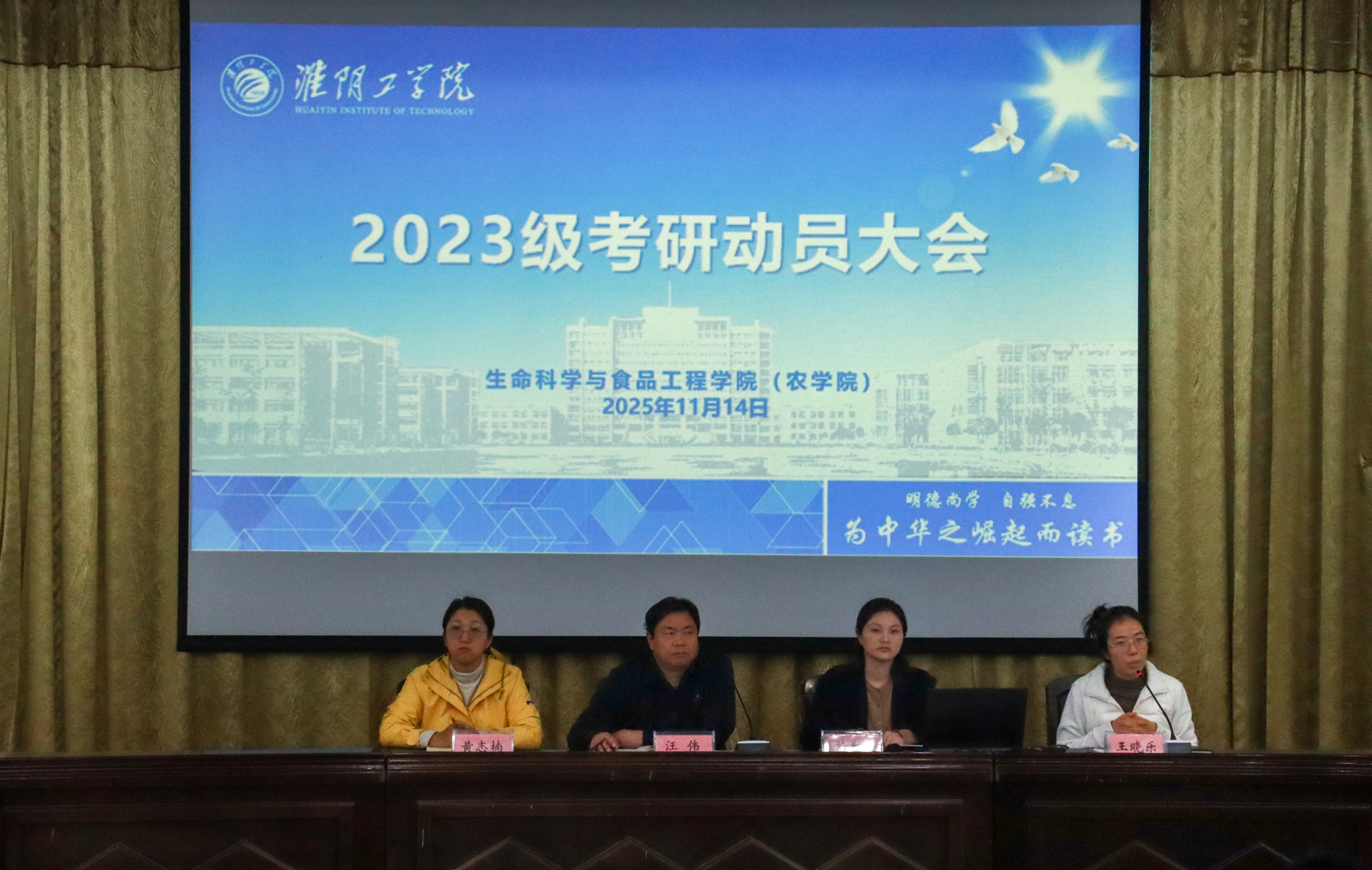 为帮助2023级学生明确考研目标、规划备考路径,淮阴工学院生命科学与食品工程学院(农学院)于11月14日在图书馆报告厅召开2023级学生考研动员大会。学院党委书记汪伟,党委副书记、副院长蔡熙文,院长助理黄志楠及2023级辅导员王晓乐出席,2023级全体学生参加,会议由王晓乐主持。