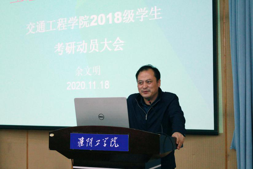 在激烈的竞争和巨大的就业压力下,为了使考研的同学对考研有更深入的了解,帮助广大学生树立正确的奋斗目标,交通工程学院于11月18日下午6:30在报告厅举行了2018级考研动员大会。参加本次会议的有交通工程学院党委书记徐才千、交通工程学院党委副书记、副院长余文明、运输系胡思涛、交通工程系主任周君、车辆工程系主任王程、陈钢和辅导员耿纪莹、吴松励。