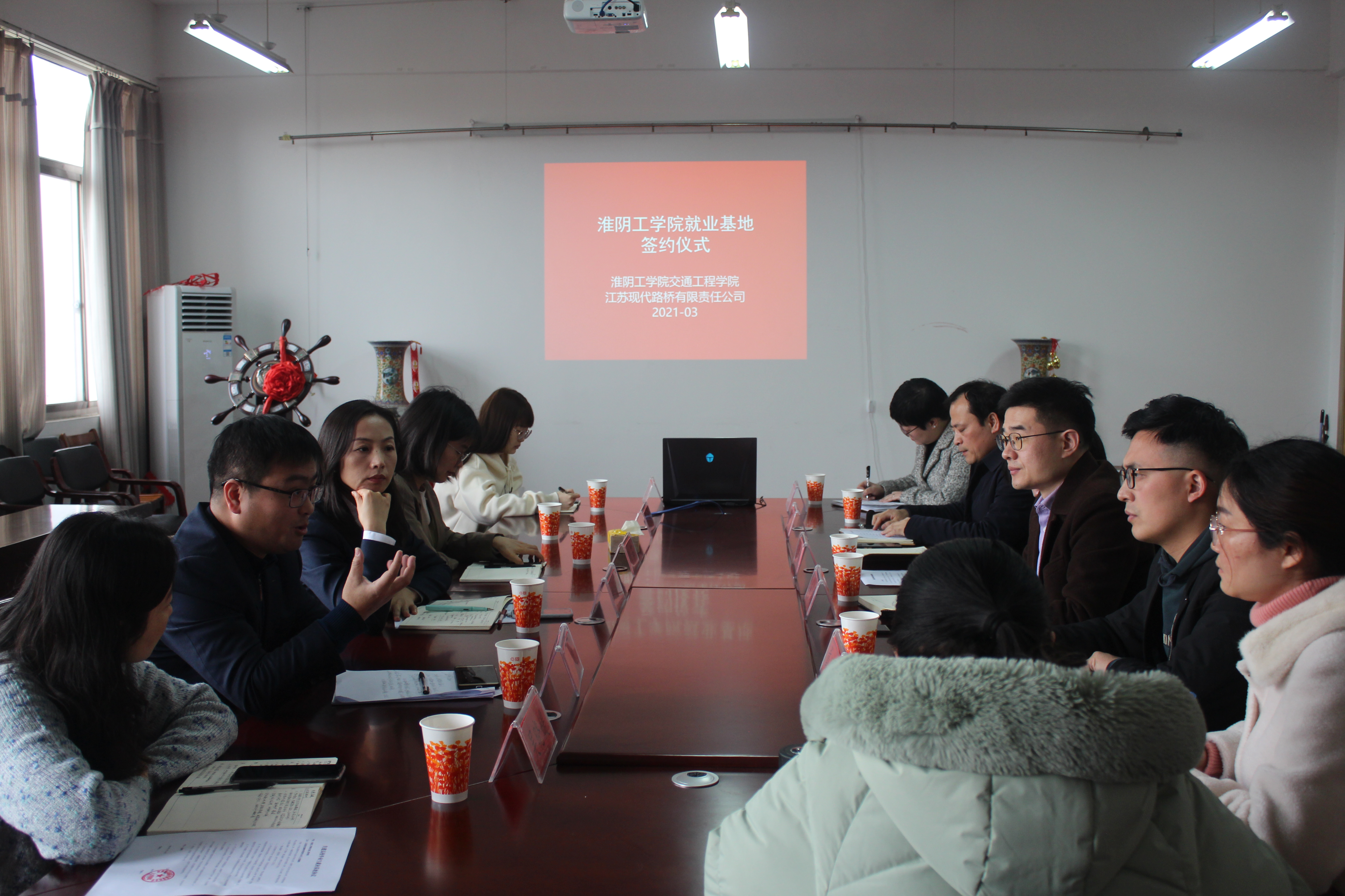 近日,淮阴工学院交通工程学院与江苏现代路桥有限责任公司于行远楼213会议室举行了校企合作座谈会。参加本次会议的人员有交通工程学院党委书记桑海云、院长包旭、党委副书记、副院长余文明以及交通、道桥专业教师及企业人员。