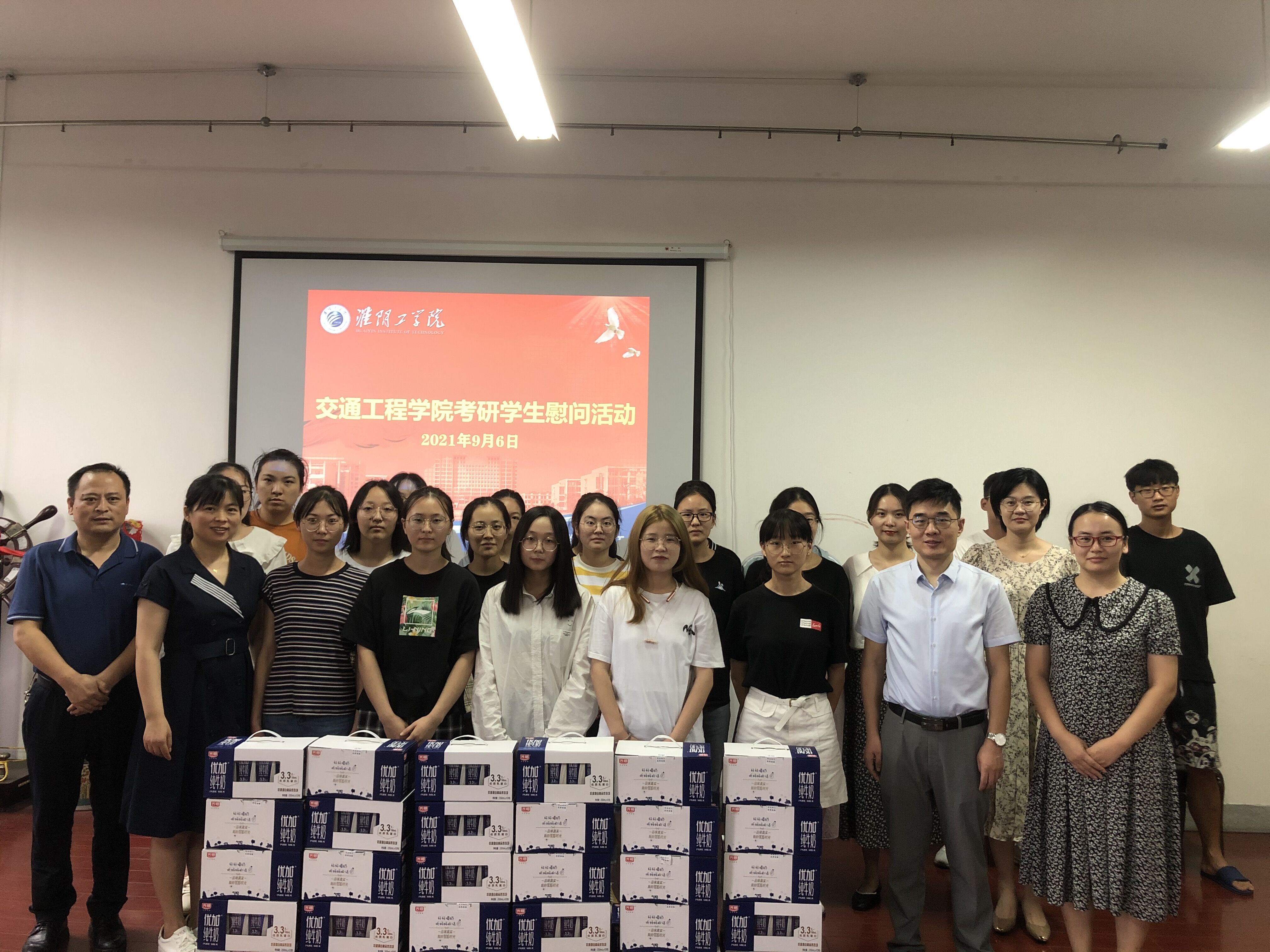 2021年9月6日,交通工程学院党委书记桑海云,院长包旭,党委副书记、副院长余文明以及全体辅导员在行远楼会议室开展考研学生慰问活动,学院领导为每一位考研学生送上一箱牛奶,希望各位学生在认真复习之余也要注意劳逸结合,学习和休息要张弛有度,要有规划性。学院会为大家排忧解难,提供考研指导,做好后勤工作,让同学们能够全身心投入到备考中,也希望每一位学生都能够“不负青春,不负韶华,不负时代”,在考研中取得好成绩,都能考取心仪的院校。
